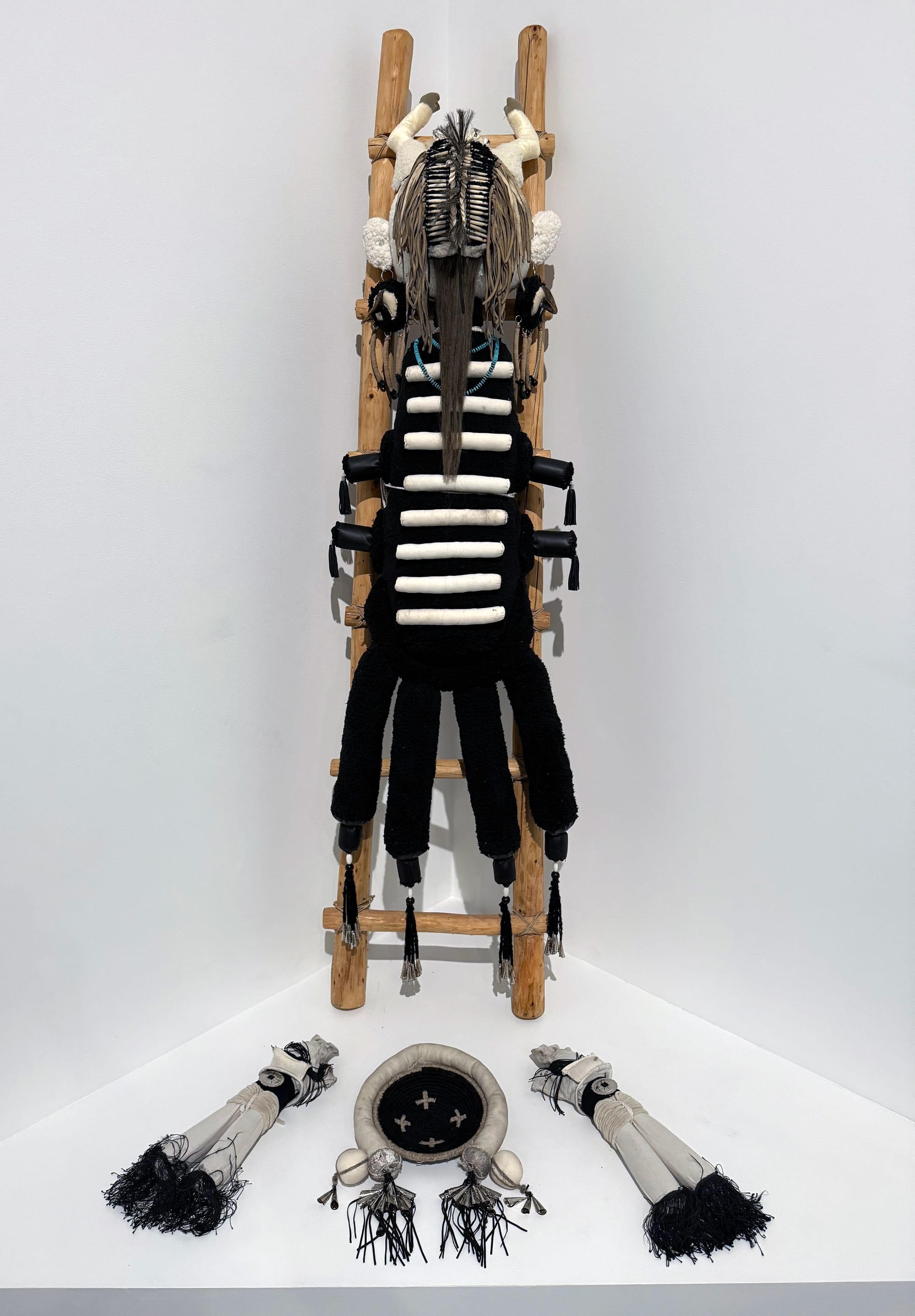 Riege’s hypnotic tableau of hanging and stationary figures, jewelry, regalia, and practical artifacts induces the effect of being dropped into a mise en scène of a Diné pictorial weaving. Though many hanging works appear to be static art objects, they retain a functional essence often central to Native artistic practices. One striking entity is a wall-mounted hollow effigy adorned in elaborate regalia — a tufted and horned crown, its face and body shields evoking buffalo bone chokers — affixed to a roughly hewn wooden ladder. At its feet lie disembodied, fringed, and bejeweled arms and a talisman made of a wool-woven basket emblazoned with the cardinal directions — a symbol in Diné cosmology representing Na'ashje'ii Asdzaa, or Spider Woman, the weaver of life. The vessel-like quality of these elements implies they are filled and employed for ceremonial use; works of this kind are typical in Riege’s rite-like performance pieces, which are ancillary to all his exhibitions.