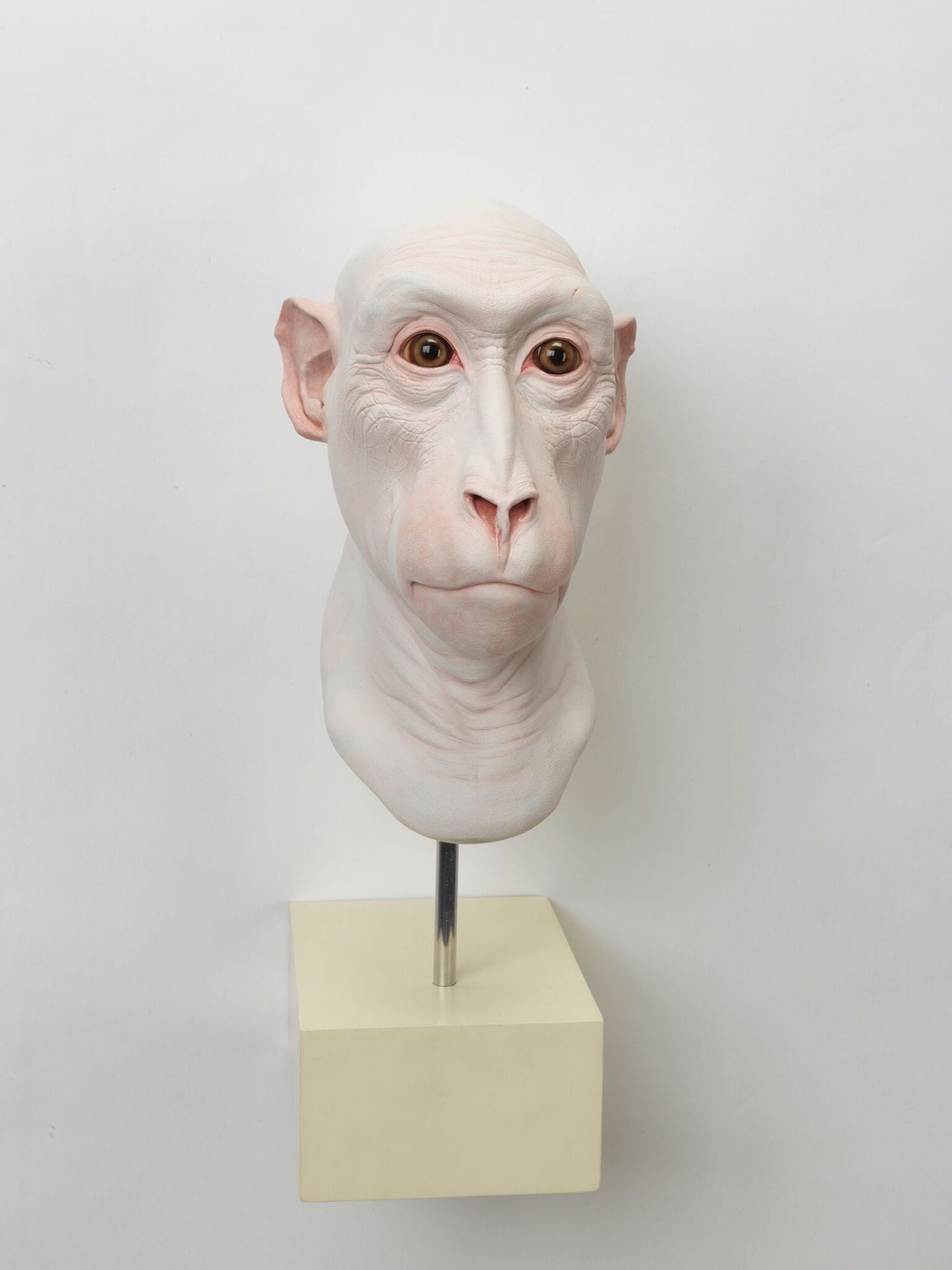 Other perplexing creatures of unknown origin appear in the exhibition, like the biologically ambiguous “Ebie” (2002), a foreign yet familiar simian resembling possibly either the missing link between the great apes and humankind from our evolutionary past, or some futuristic lifeform yet to emerge. In “Scuttle” (2012), a giant snail bulges from its shell to the point of bursting through the calcium; meanwhile, hundreds of small snails surge over a cast beer stein in “Kleine Schwarmerei” (2014). Beer traps are sometimes employed in gardens to kill snails, which go to drink the beer — then fall in and drown. The journey is definitely preferable to the destination; despite the difficulty and seeming futility of the snails’ climb in “Kleine Schwarmerei,” there is still beauty in the present moment.