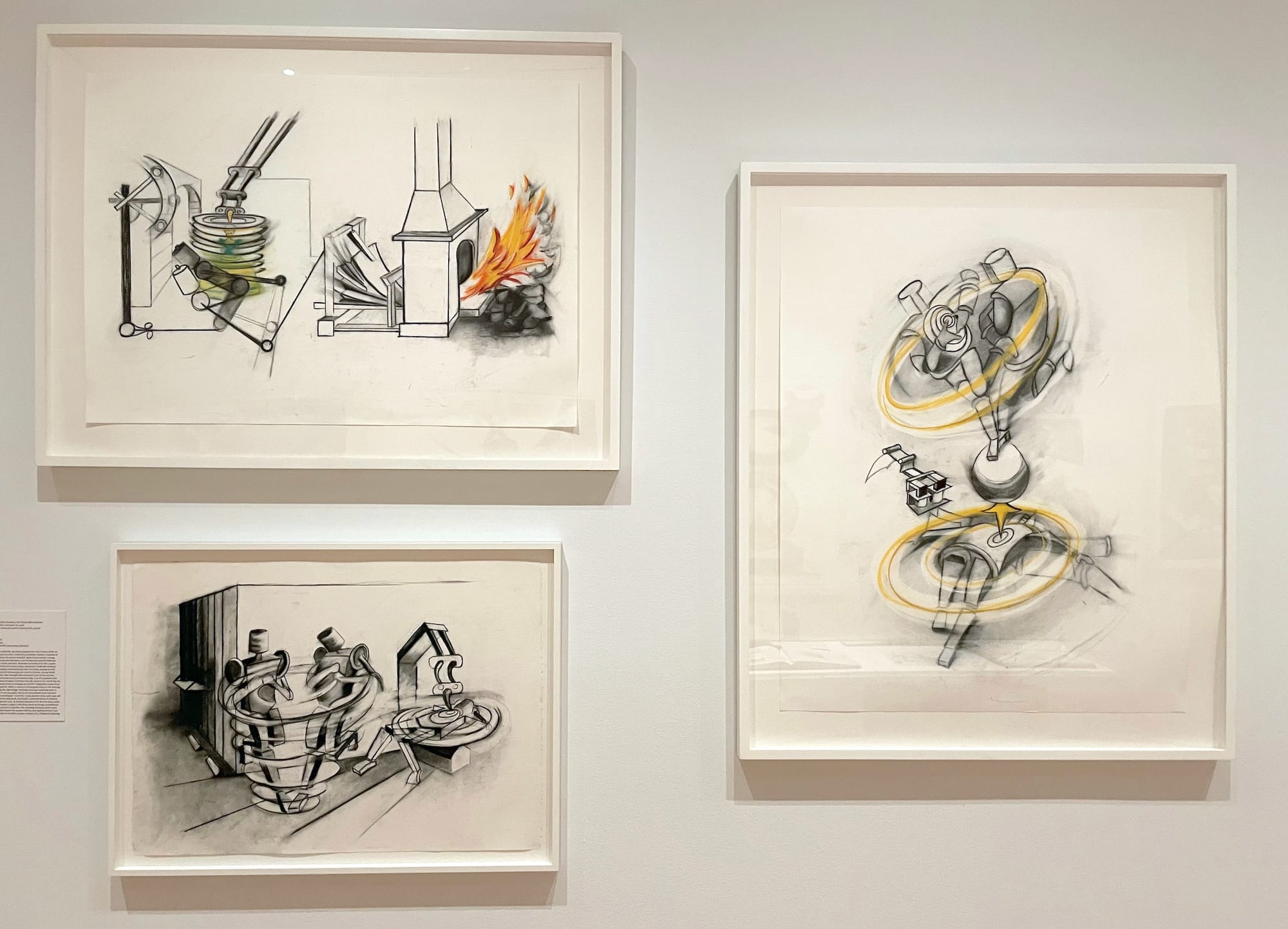 Visually, the schematic images are closer to Russian Constructivism and even some of Giorgio de Chirico’s metaphysical paintings than to anything from 1980s New York: In many drawings, faceless, automaton-like figures appear to be trapped in alienating scenes — the charcoal drawing “Cinderella 6” (1985) portrays a character being repaired or, more likely, tortured by a machine — while quick circular lines signify motion, in contrast to the stiffness of the bodies.