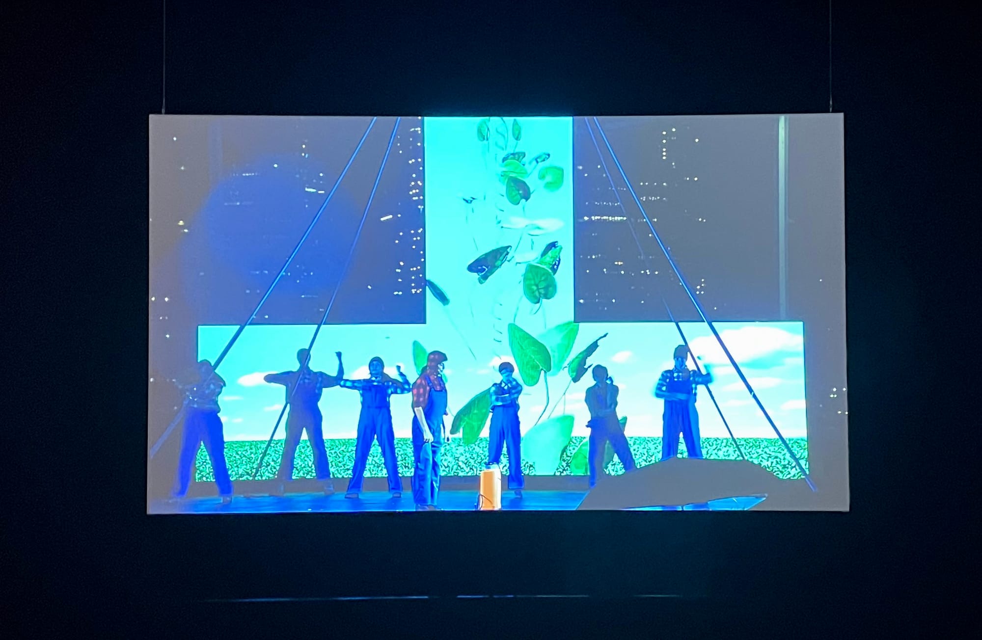 Presented live at Performa 2021, the film juxtaposes farmers working in unison with big-city stock market scenes and, most strikingly, the towering beanstalk itself. With a Manhattan skyscraper in the background, Jack climbs the beanstalk, sometimes clinging for life, while a dancer as a personified sprout shimmies upward à la Cirque de Soleil, beckoning him along.