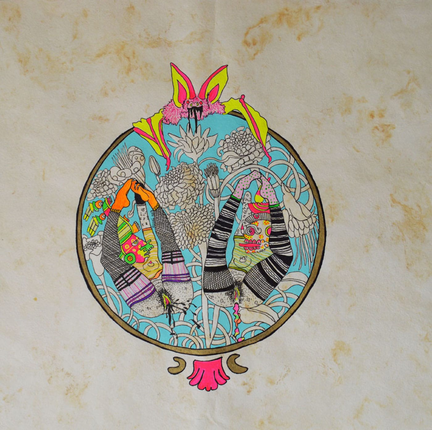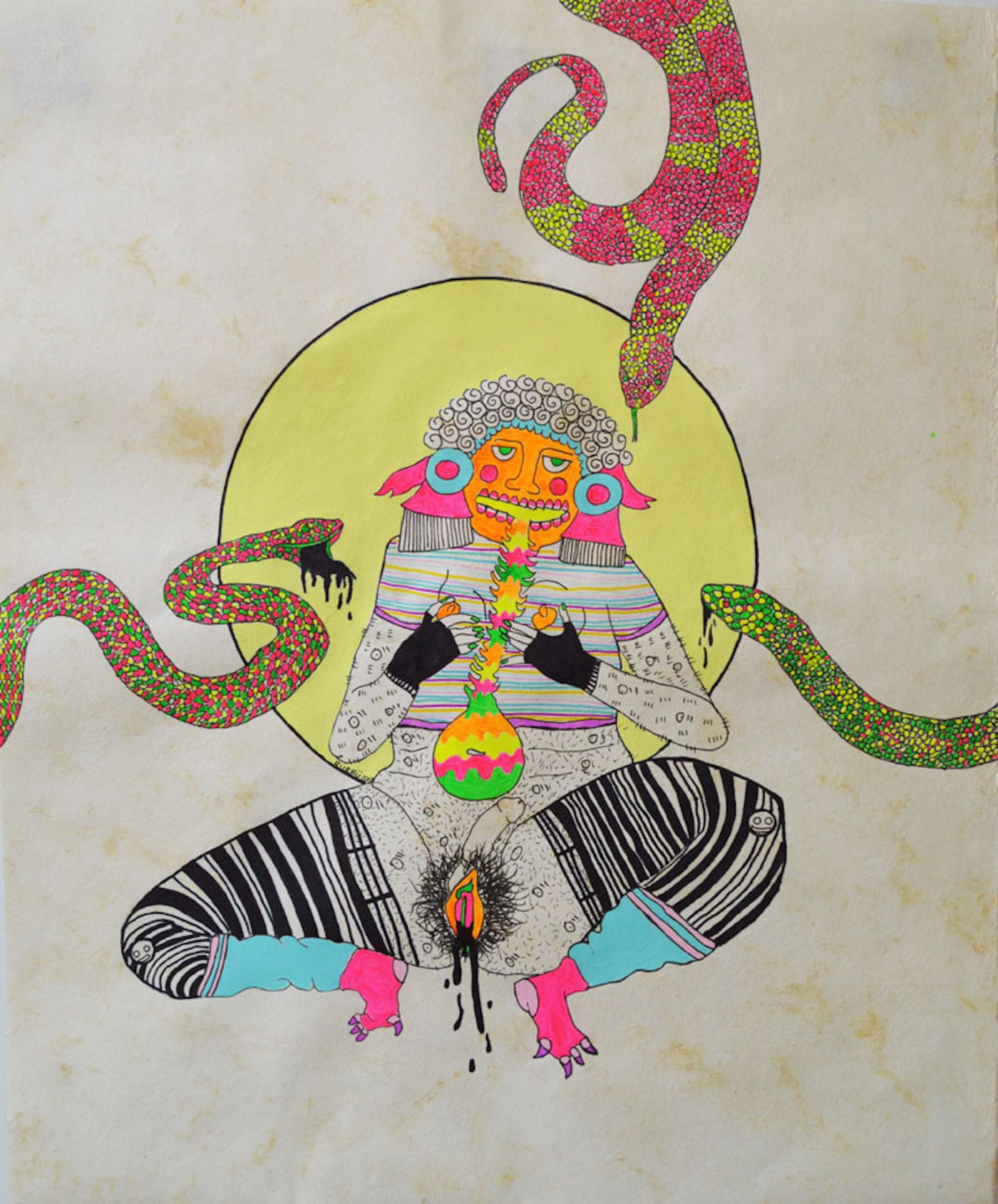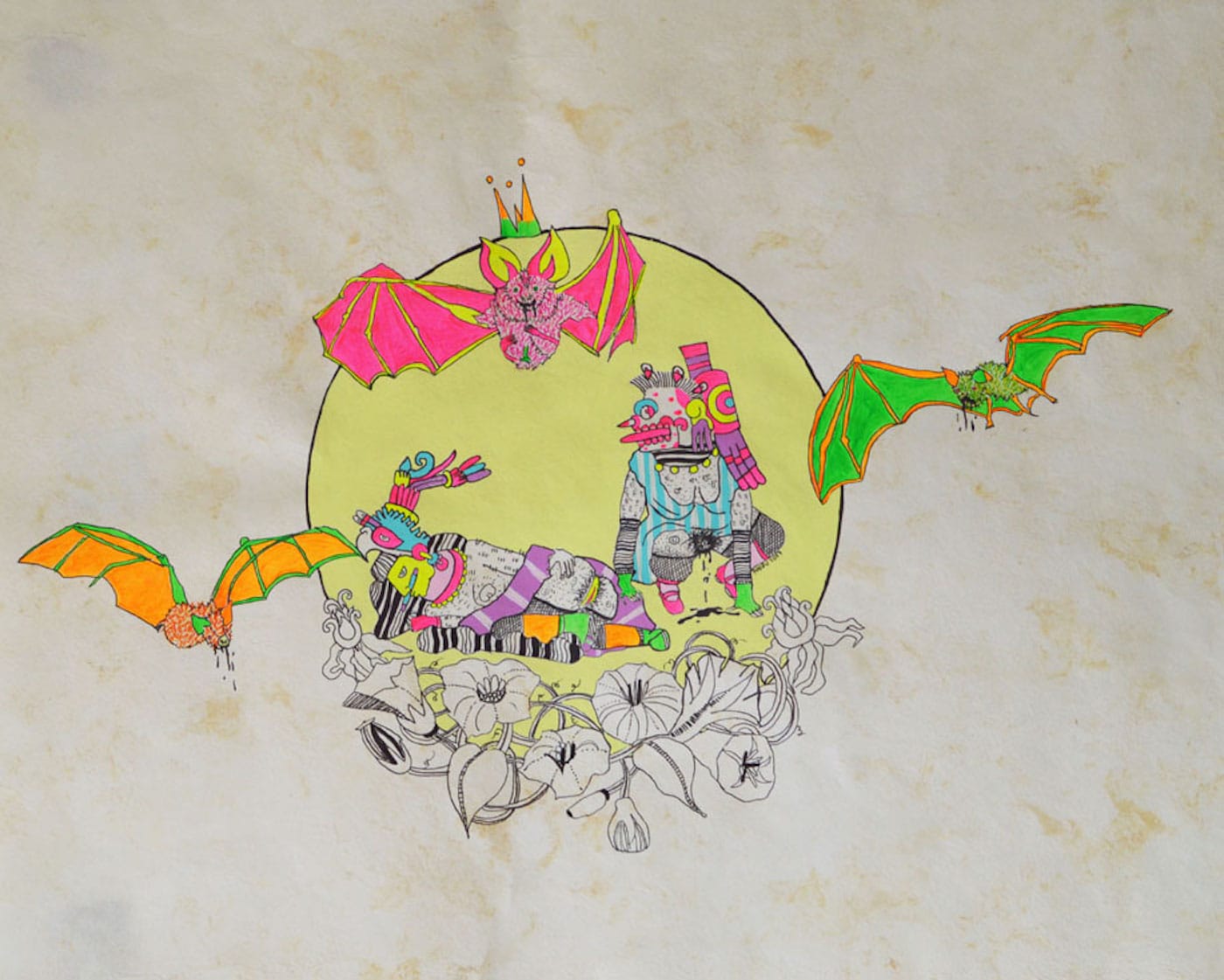 In Mipanochia’s amate paintings, masked figures wearing fishnet stockings lounge in the nude, pleasuring themselves and dripping with all manner of bodily fluids. Tlaltecuhtli is a deity, often referred to with both female and male descriptors, whose dismemberment by the male gods Quetzalcoatl and Tezcatlipoca resulted in the creation of the world. In one painting, Mipanochia unambiguously renders the deity with both female and male genitalia. As Quetzalcoatl and Tezcatlipoca, in the form of sinister serpents, encircle Tlaltecuhtli, the deity casually plays with their own breasts as if unconcerned by the approaching menace. This is either a more triumphant revision of the earth’s genesis or an homage to Tlaltecuhtli’s sacrifice.