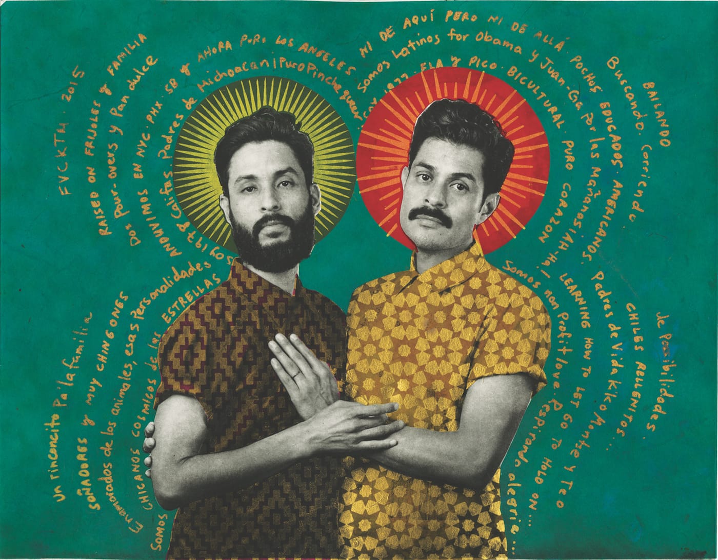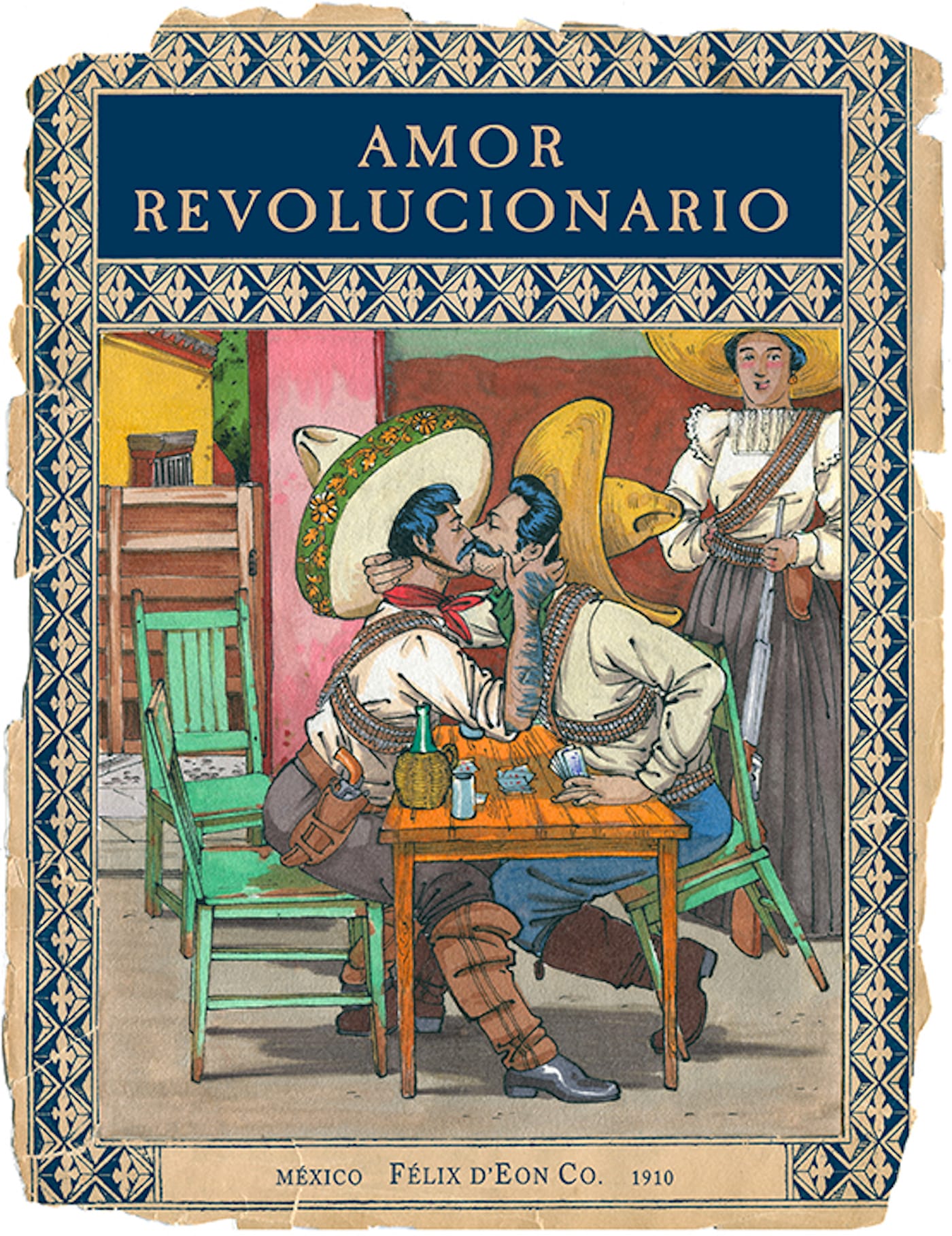 Felix D’Eon’s work is also grounded in traditional illustration practices, employing early-20th-century graphic styles to imagine queer love in revolutionary-era Mexico. “Amor Revolucionario” (c. 2016) is presented as the torn cover of a book from 1910, showing two male revolutionaries in wide-brimmed hats and bandoliers kissing each other while an armed female revolutionary looks on. In a faux magazine cover, “La Tonalteca” (c. 2016), two women, one nude and the othering wearing a long floral dress, embrace in an open desert landscape. A town is visible in the distance, but, like the two revolutionaries, the women seem unconcerned about being seen. Regardless of D’Eon’s use of century-old styles to depict heroic queer love, the illustrations don’t emit a sense of irony or pastiche, nor do they appear to be attempts to shock. Instead, they exhibit a sincere interest in graphic traditions and a desire to depict a history that always existed, whether it was widely represented or not.