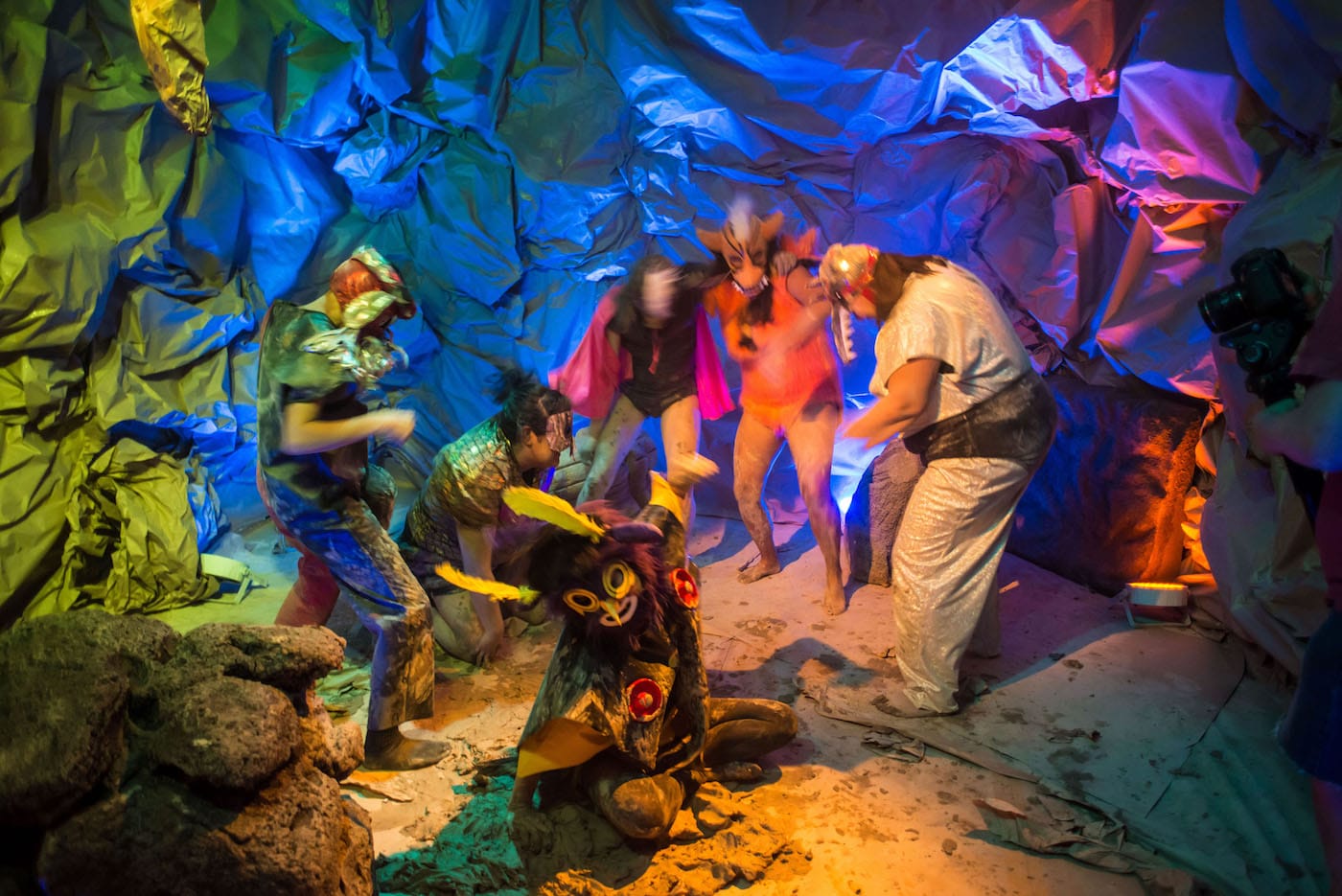 “The Formaldehyde Trip” (2017) is a series of musical videos by Naomi Rincón Gallardo depicting a fictionalized account of murdered Mixtec activist Bety Cariño’s journey to the underworld. These videos invent a feminist cosmology that draws inspiration from diverse places, including Indigenous religion, riot grrrl aesthetics, and campy television. One of the videos, “Mud,” resembles an episode of Isabella Rossellini’s Green Porno or Lost in Space shot in the underground den of queer Mesoamerican punk gods. In the videos, chants like “oppressed but not defeated” provide a subtext with which one can read most of the works in Queerly Tèhuäntin | Cuir Us.