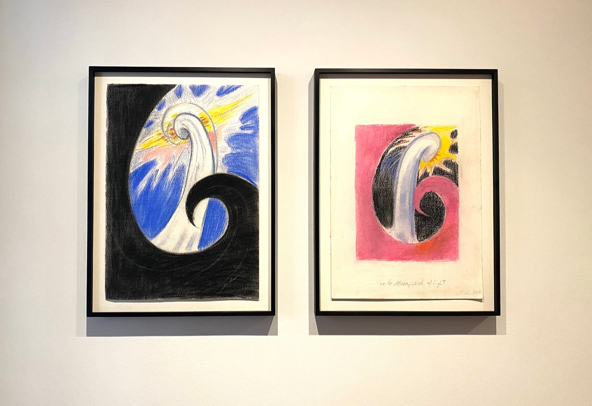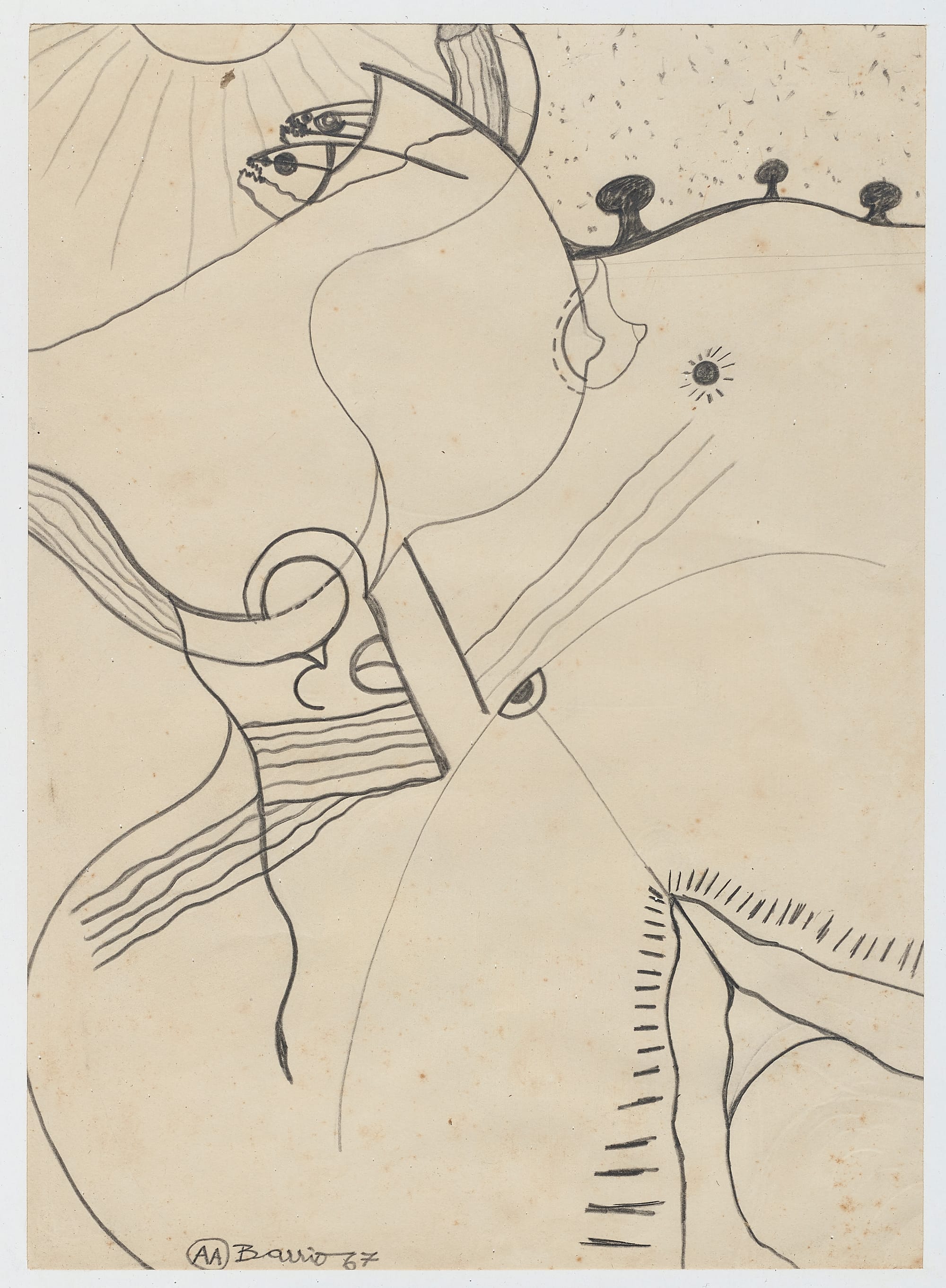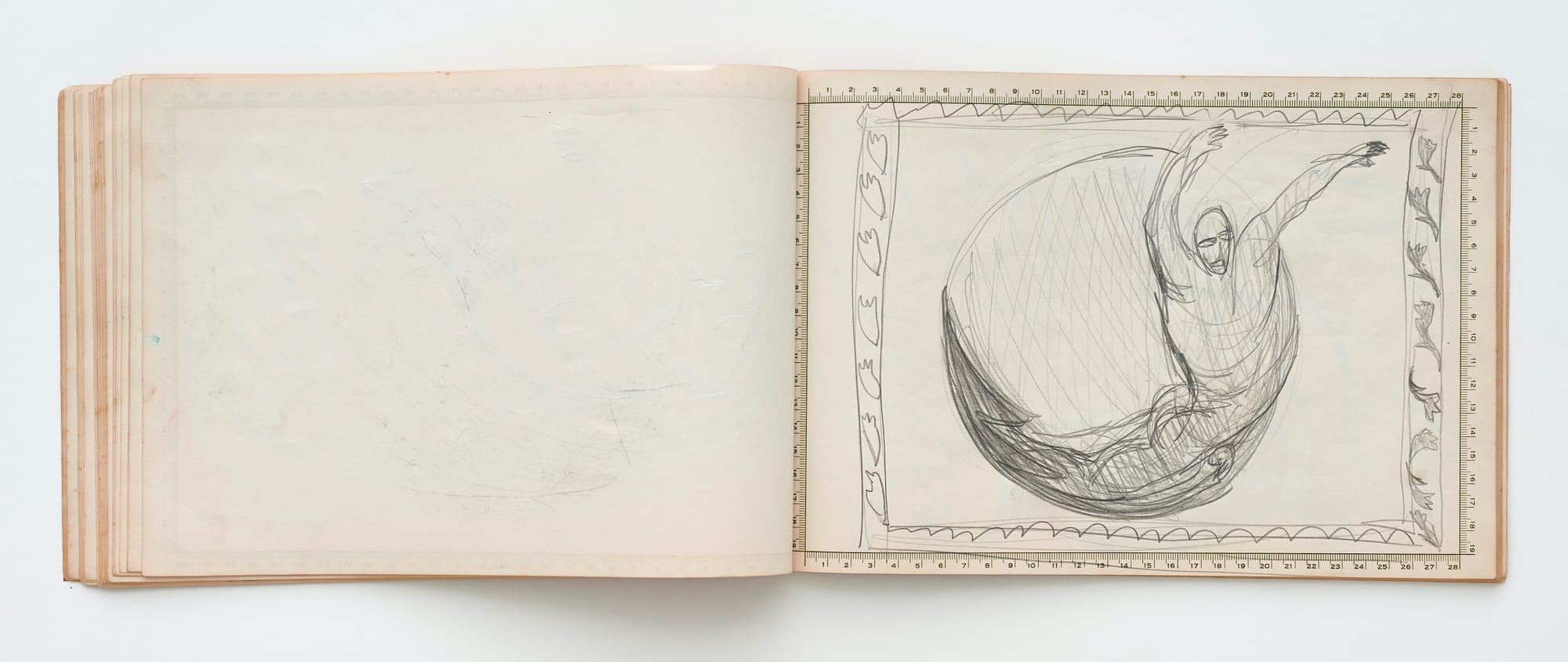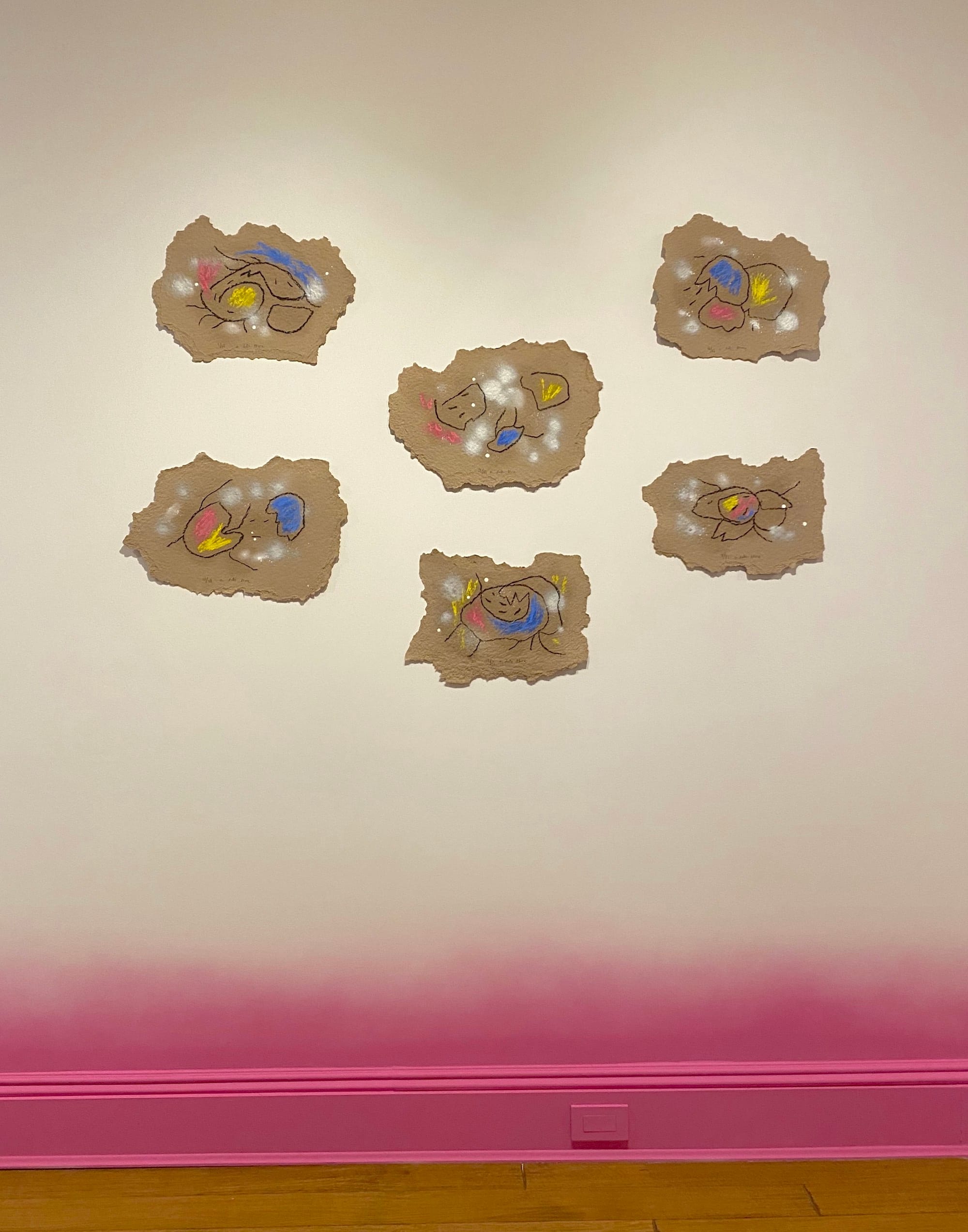 The celestial and the firmament are in dialogue with the terrestrial in pieces like “Composição erótica" (Erotic Composition) (1967) by Luso-Brazilian conceptual artist Artur Barrio, as well as a date there (I-VI) (2022), a series of six abstract drawings by Tadáskía that tell a story of three forces through the interaction of three colors — blue, pink, and yellow — that are separated and then come together, and the intricate “Díptico Um" (Diptych One) (2022) by Castiel Vitorino Brasileiro, whose practice is informed by psychology and Afro-Brazilian syncretic religions.