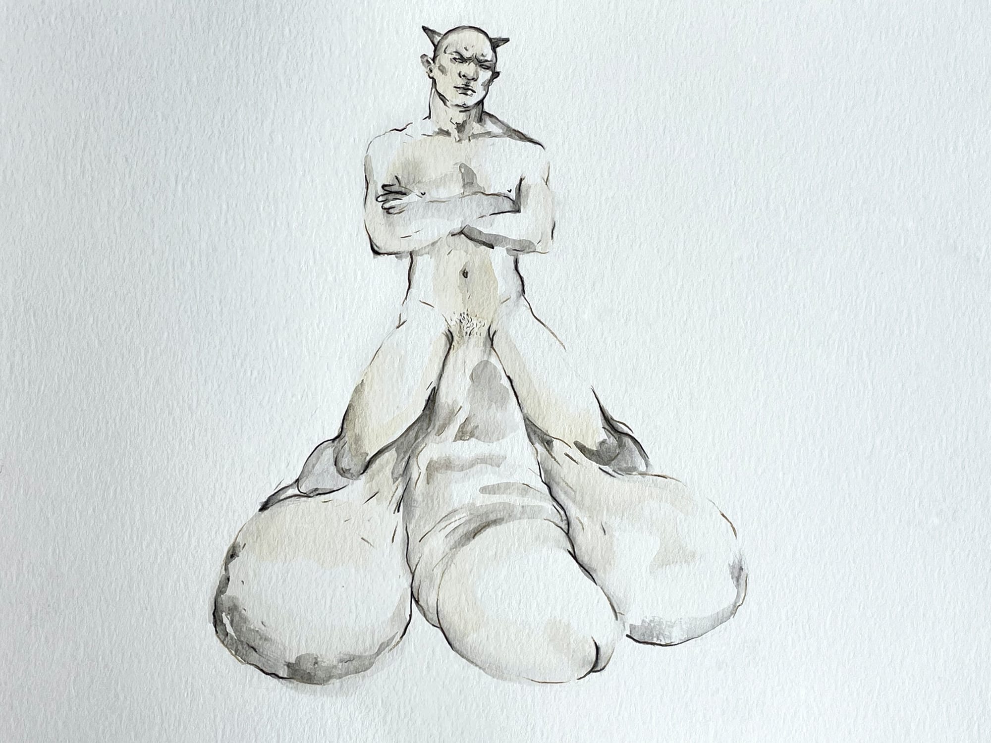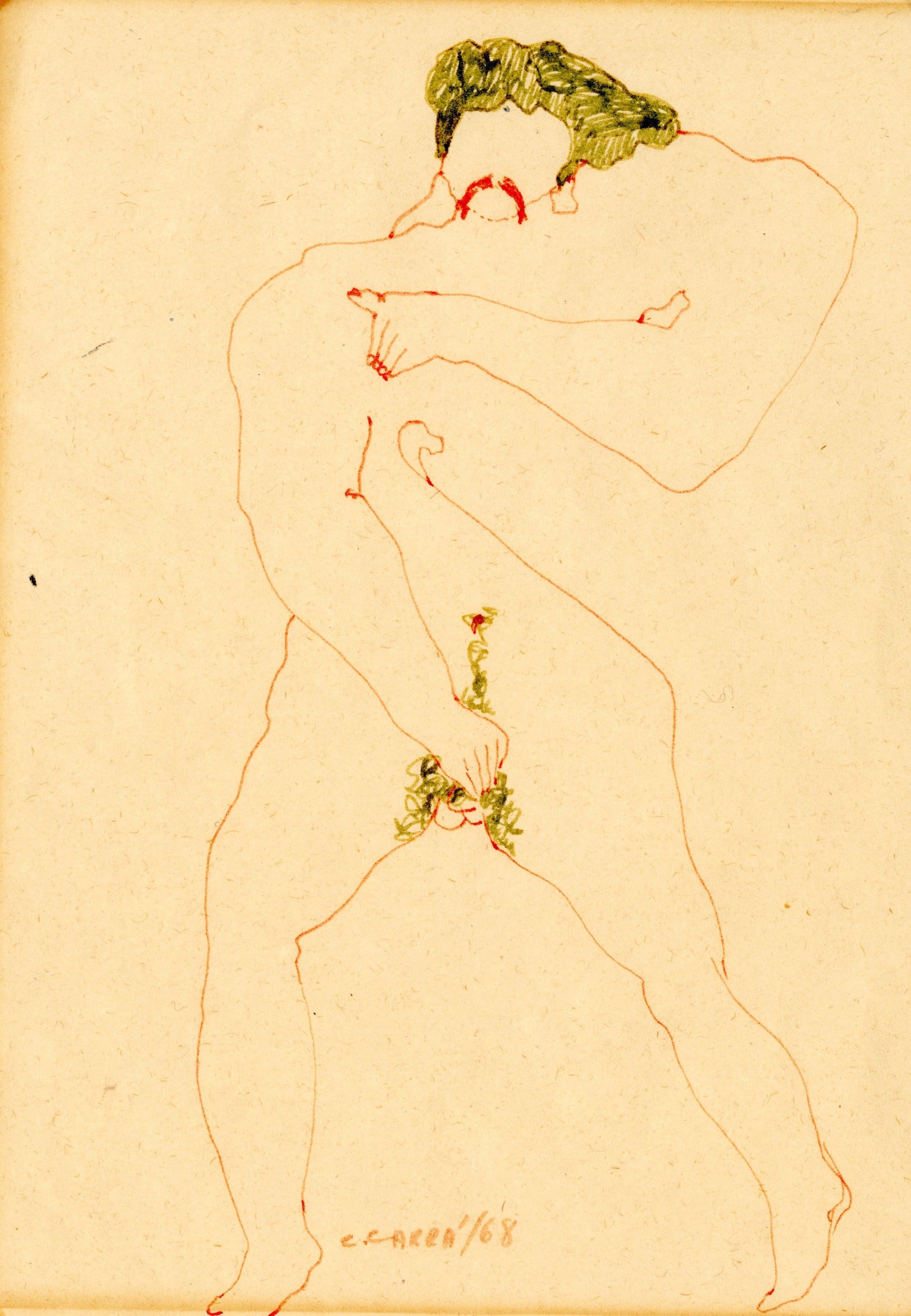 A similar sensibility is expressed by reframing or transforming the human body. In “Untitled” (1968), Italy-born Argentine Carmelo Carrá portrays a naked figure clutching his genitals through an interrupted, diaphanous outline. A mesmerizing depiction of a demon with inflamed testicles and a penis, by Colombian artist Carlos Motta, “seduces more than it terrifies,” as the curators write. In this vein, the watercolor “Formas de alargar un pene" (Ways to Enlarge a Penis) (2021) by Wynnie Mynerva elongates the phallus, stemming from their work examining sexual conceptions and hierarchies.