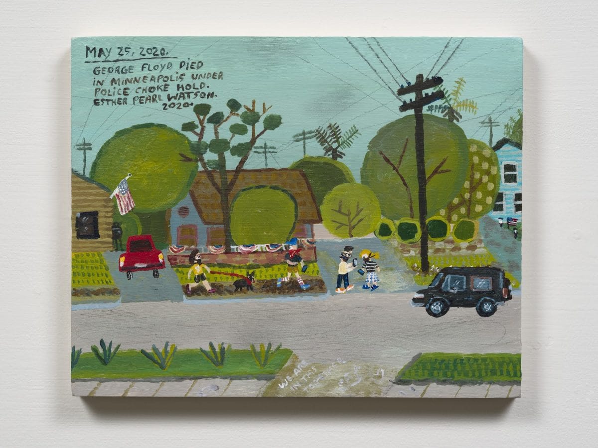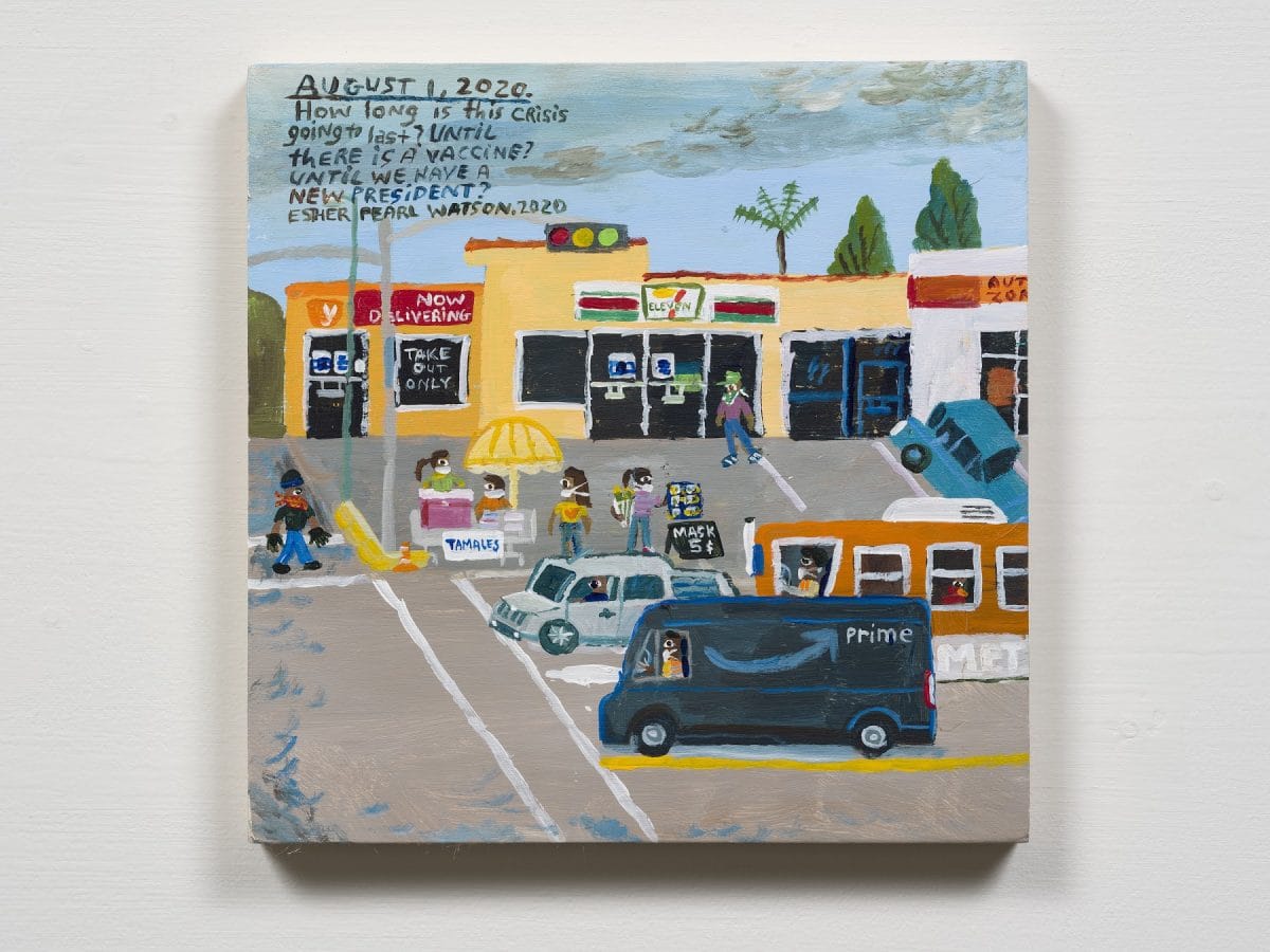 Esther Pearl Watson finds a way to channel the surrounding strangeness of this period — and our collective adapting to an unprecedented time — in Safer at Home: Pandemic Paintings at Vielmetter Los Angeles. In more than 100 paintings, the artist froze mundane moments that she observed during the pandemic, which collectively catalogue larger shifts like social distancing, racial uprisings, and economic uncertainty.