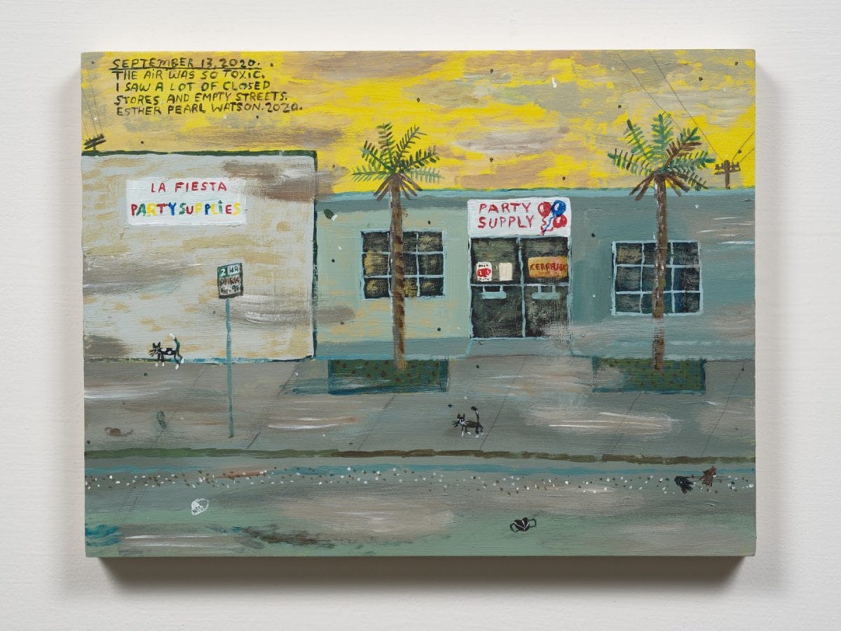 Watson describes the pieces as “small, intimate records” of the scenes she encounters on her drive to her studio in Los Angeles. She imbued her “obsessive memories” into each small painting, created in the style of the ex-voto, an artwork traditionally acknowledging a tragic event intercepted by divine forces. The artist sees these pieces as signs of resilience.