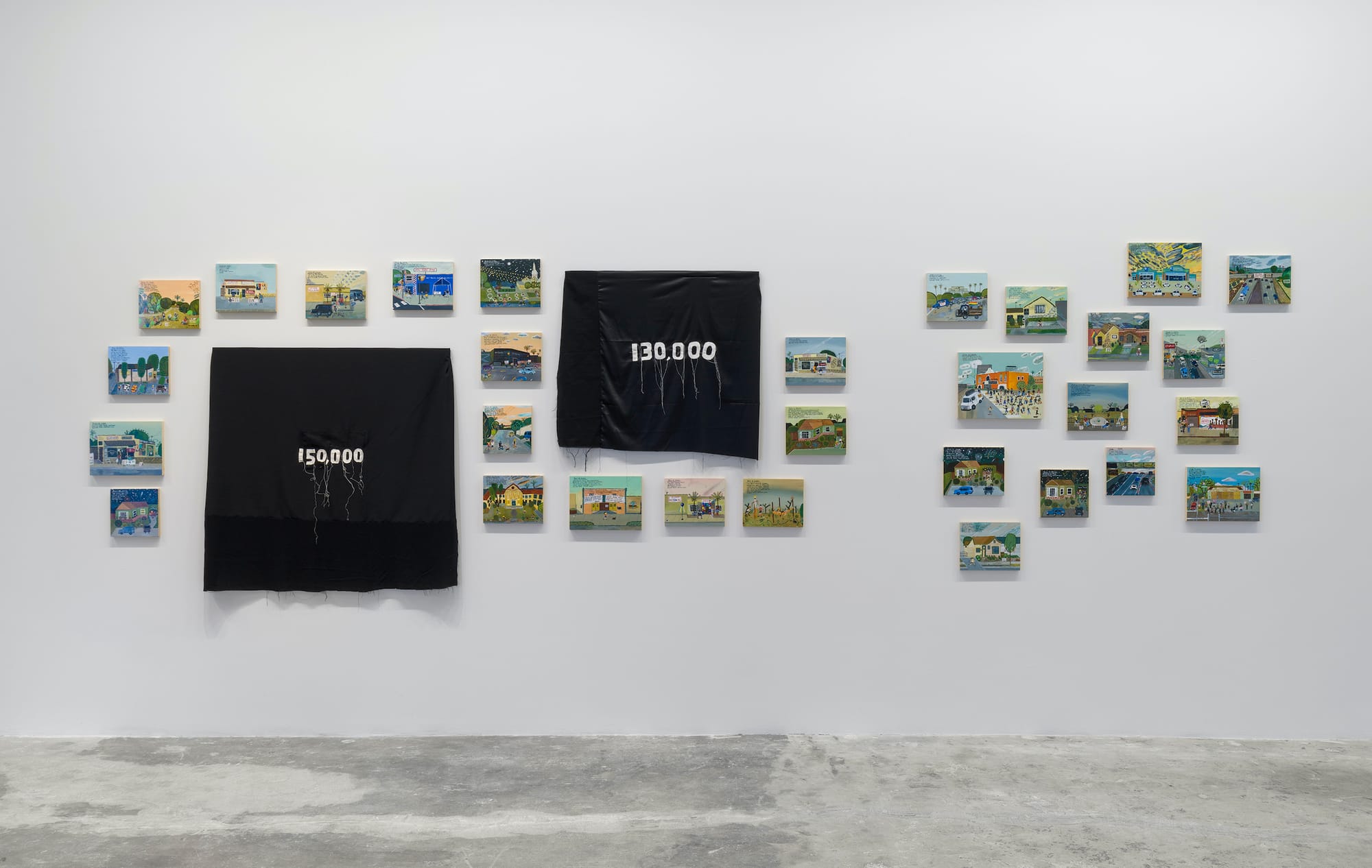 Black cloth banners interrupt these clusters of paintings, showing the number of deaths in the US from COVID-19, starting with one death and increasing to 238,000.