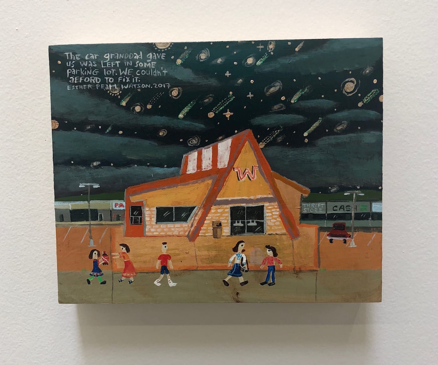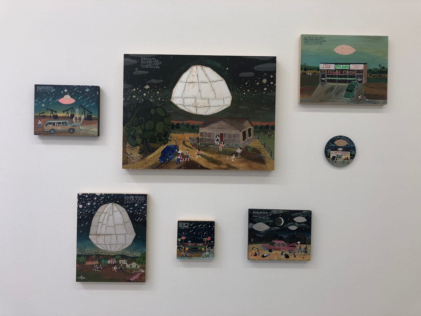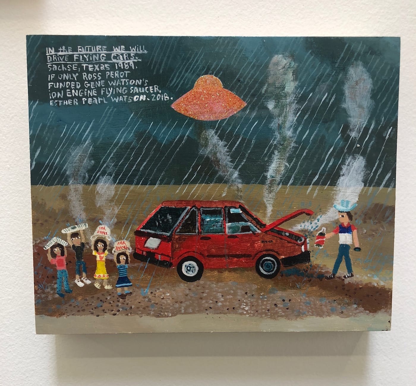 Painted in the flat, colorful style typical of self-taught folk painters such as Anna Mary Robertson Moses, more commonly referred to as Grandma Moses, Watson’s paintings avoid the nostalgia often attributed to the popular rural American painter. Her pieces are both tragic and comedic, and always accompanied by text, painted directly on the image, that both describes the story depicted and forms the title of the work. One of the major characters is the artist’s father, Gene Watson, a man whose hopeless attempts at building a successful flying saucer are best represented by the painting “In the Future” (2018). In it, Watson depicts her family stuck in the rain with a broken-down car, while the text caption states: “if only Ross Perot funded Gene Watson’s ion engine flying saucers.” While the titular Gene Watson works in a cowboy hat underneath the car hood, the rest of the family attempts to block nature’s unforgiving torrents not with umbrellas, but with plastic “thank you” bags. An awkward and glittering flying saucer hovers in the air above them, a trope Watson repeatedly utilizes in her work.