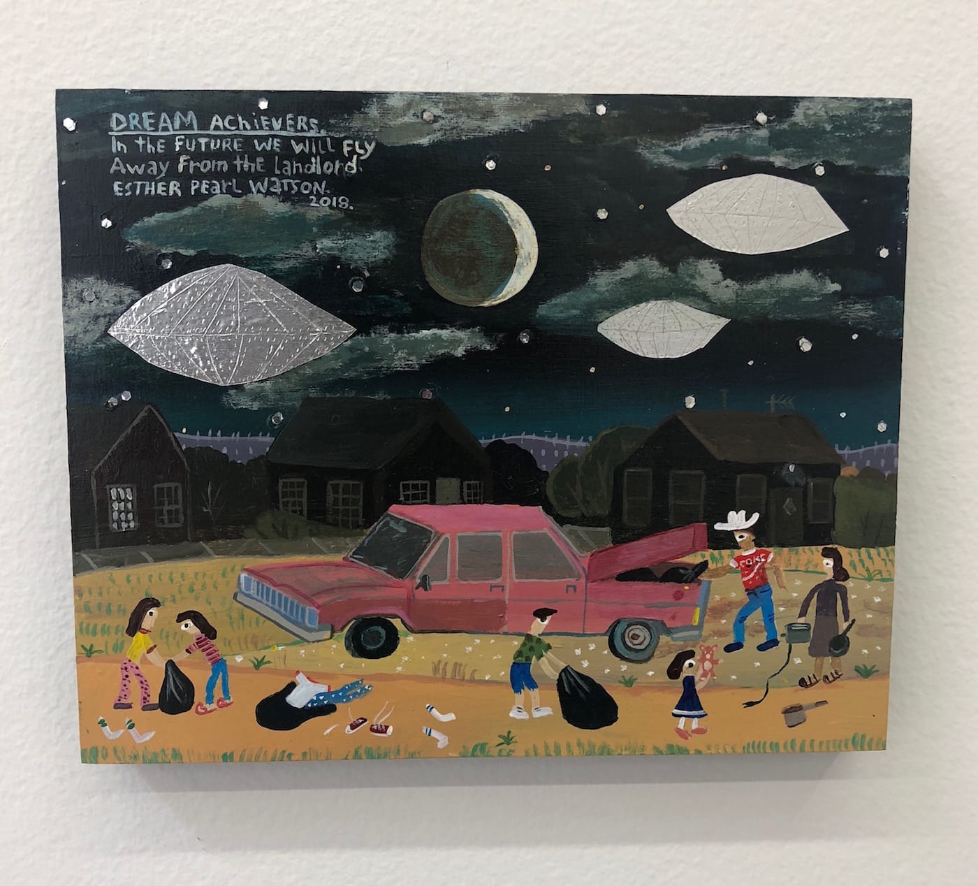 The real and enduring disappointments characters like Gene Watson and his family experience are exemplified in paintings like “Dream Achievers: Fly Away From the Landlord” (2018), which contains a funny but heartbreaking concern no child should have to think about—“in the future we will fly away from the landlord.” The image depicts the family packing up the car underneath the shield of night, using grocery bags to contain their treasured possessions. Typical of Watson’s painting and her father’s dream life, a smattering of flying saucers dots the sky above them, and while they form a beautiful image, both as paintings and fantasies, these shiny orbs cannot pay the rent, which looks to be long overdue.