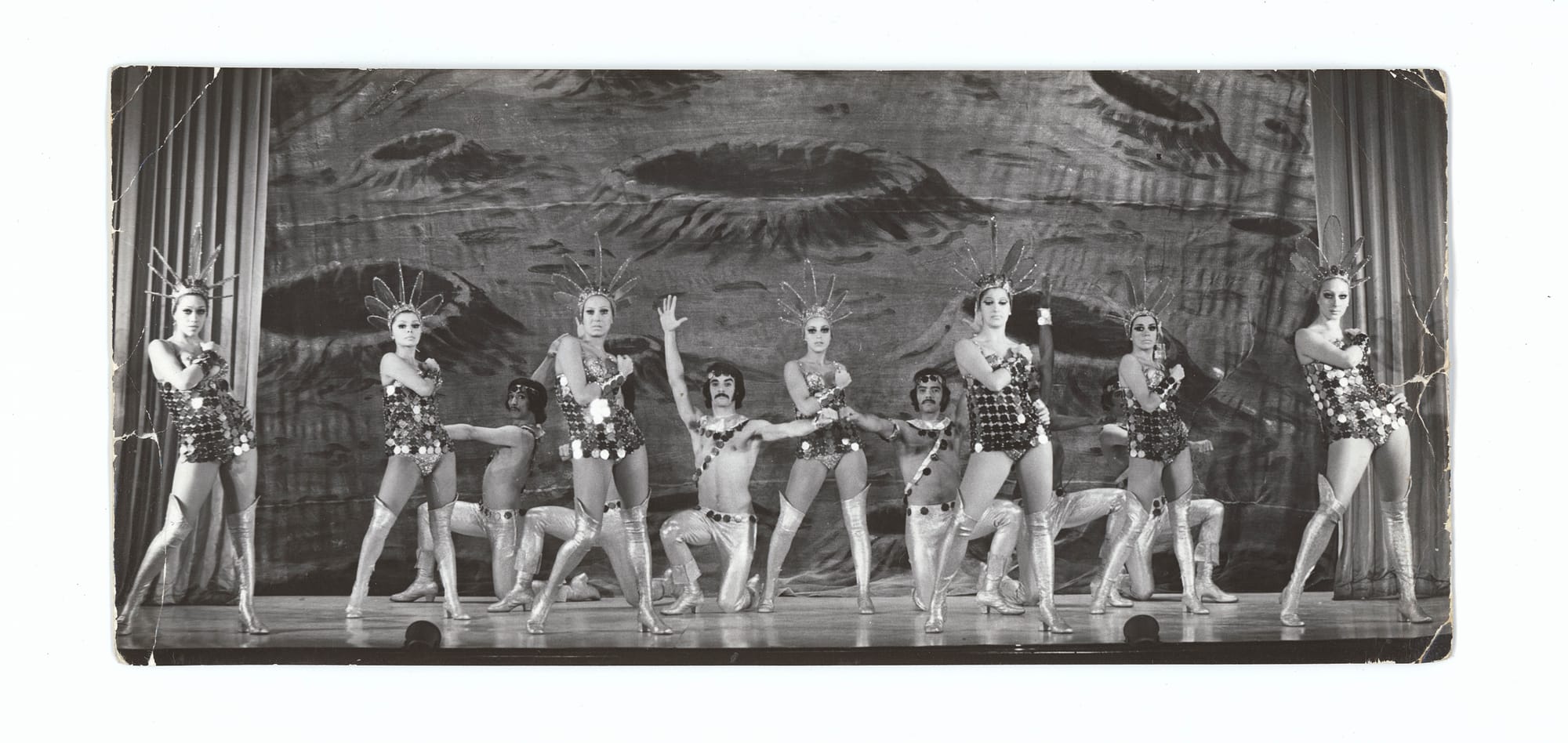 BUENOS AIRES — Momentarily still on a broad staircase, covered in pink, blue, and cream stripes, the sisters and showgirls — or vedettes — Gogó and Ethel Rojo gaze out toward an invisible audience. The ruffles of the stage’s curtains seem to sway delicately in the image, and the colossal, glittering showpieces, attached as if peacock fans to their backs, bristle in anticipation of their next movement. With so much pink, shimmer, and extravagance, the image, “Hermanas Rojo, Maipo superstar” (1973), should be too sweet to handle for more than the briefest glance. And yet the rows of wooden orchestra seats and the slight skewing of the frame seem to add gravity to the spectacle, drawing attention to the process of its production. This trace of artificiality makes the production feel all the more sensational and extravagant.