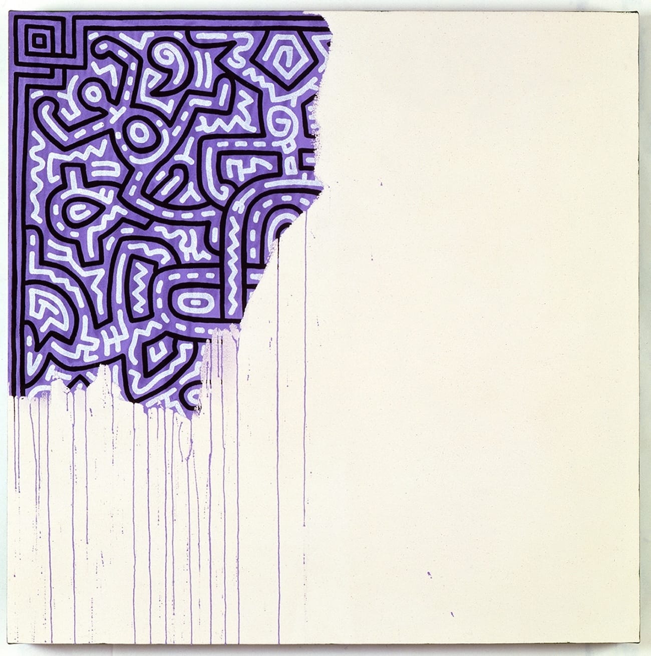Haring’s “Unfinished Painting” (1989), a white canvas with a purple background that covers only the top-left quadrant, is layered over with the illustrator’s iconic, heavy-lined figuration and designs that end abruptly. Aside from a few streaking purple drip lines that slide down the untouched canvas beneath, the punctuated painting is ear-splittingly silent beyond the broken edges of what Haring had rendered in his recognizable visual language, alluding to the thousands of lives cut short during the beginning of the epidemic that affected many in the LGBTQ+ community.