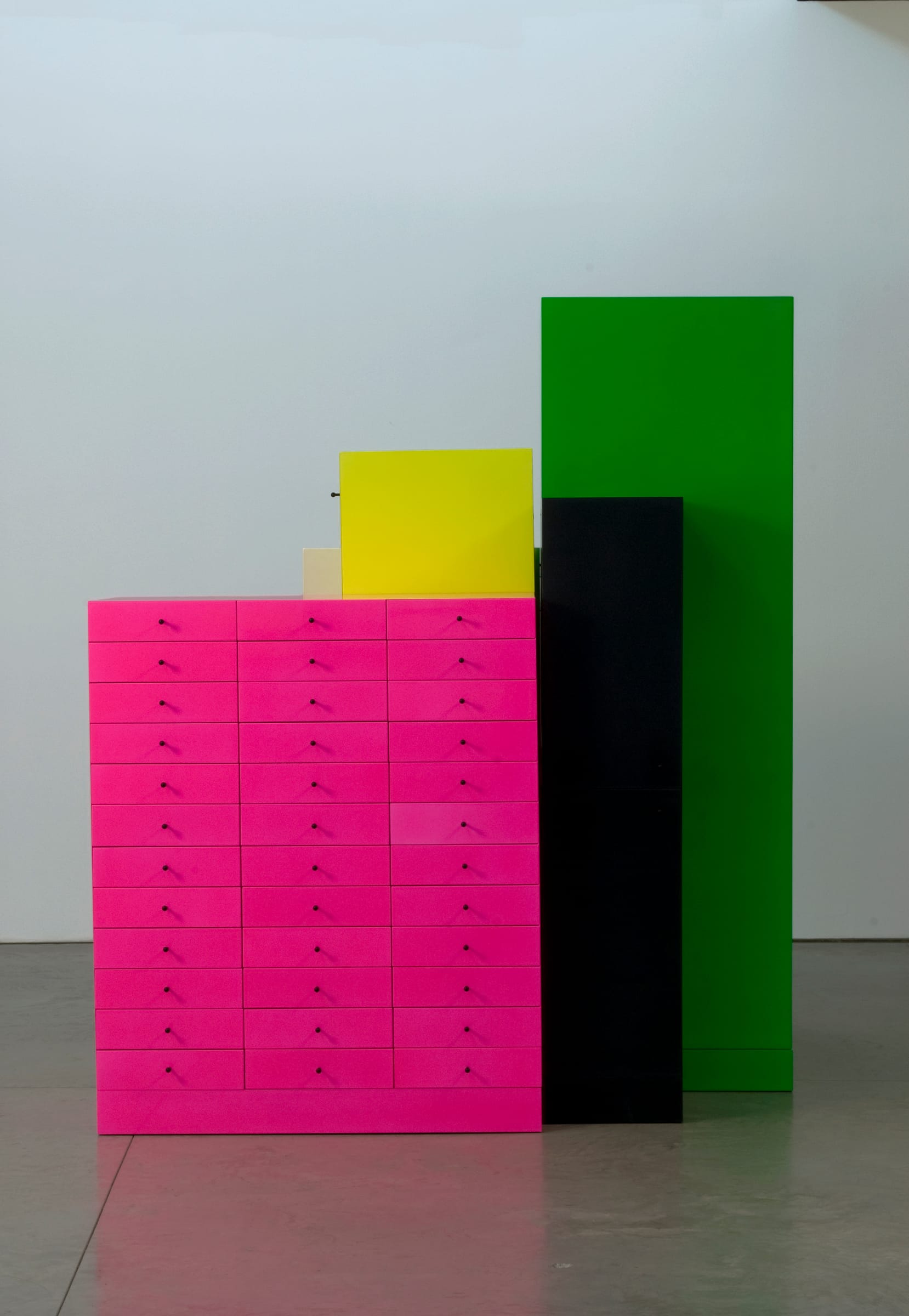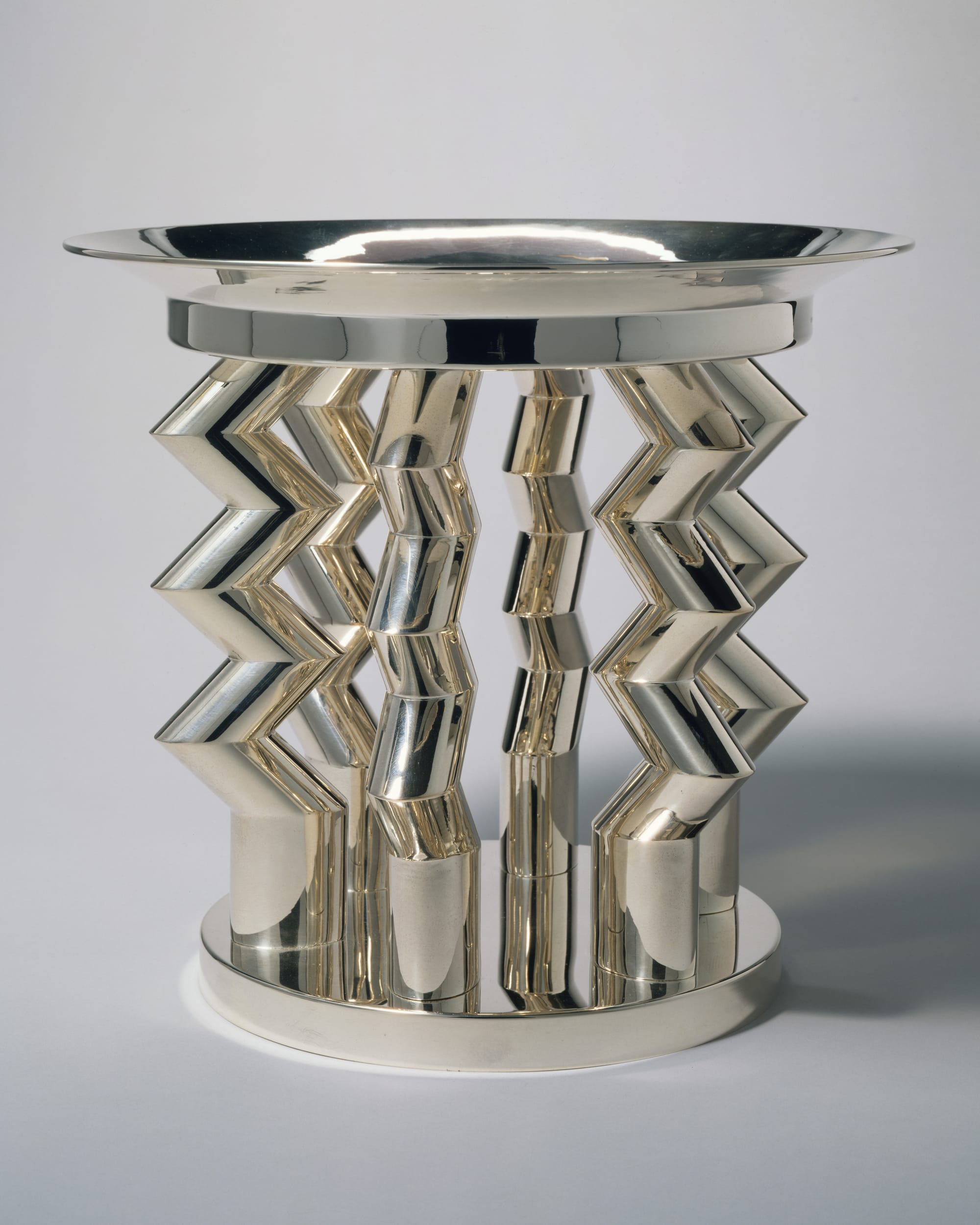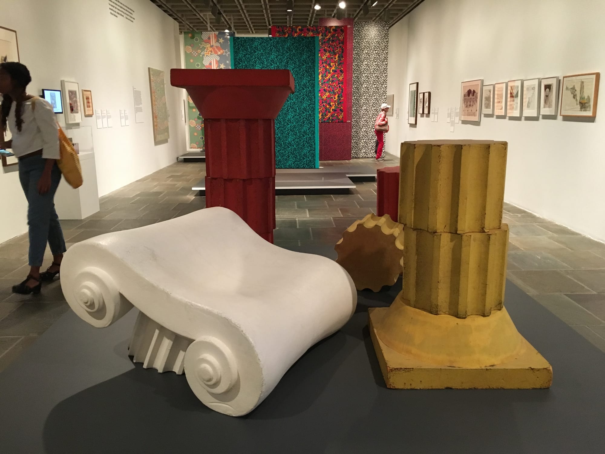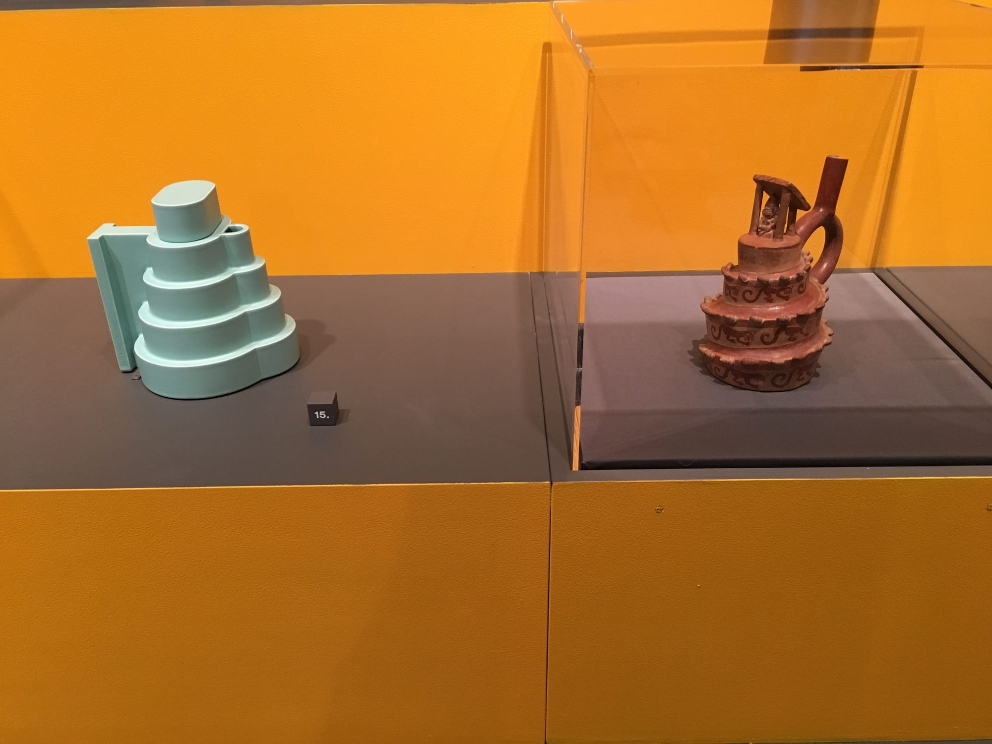 Viewed through the prism of the Valentine episode, what comes next for Sottsass makes a lot of sense: After a brief stint working in George Nelson’s office, he abandoned corporate modernism and hit the road. He traveled the world studying the art, architecture, and design of dozens of different civilizations, and took a transformative trip to India in 1961. The work that emerged from these journeys is his most timeless, and for me, this section of the exhibition is the most successful, perhaps thanks to my pro-ceramics bias. As the sixties unfolded, Sottsass became fascinated with totems of various kinds and began creating large sculptures comprised of ceramic cylinders. Five of the totems that comprised the Menhir, Ziggurat, Stupas, Hydrants, and Gas Pumps (1965–66) project (first exhibited at Galleria Sperone in 1967) are shown in a group, inside an egg yolk–yellow room. Around the perimeter, smaller ceramic works with the recognizable steep-stepped silhouette of a ziggurat are shown with ancient analogs: an architectural vessel made between 400 and 600 AD from Moche culture in Peru, a metal reliquary in the shape of a Stupa from the kingdom of Kashmir in 7th–9th century India, and dozens of others.