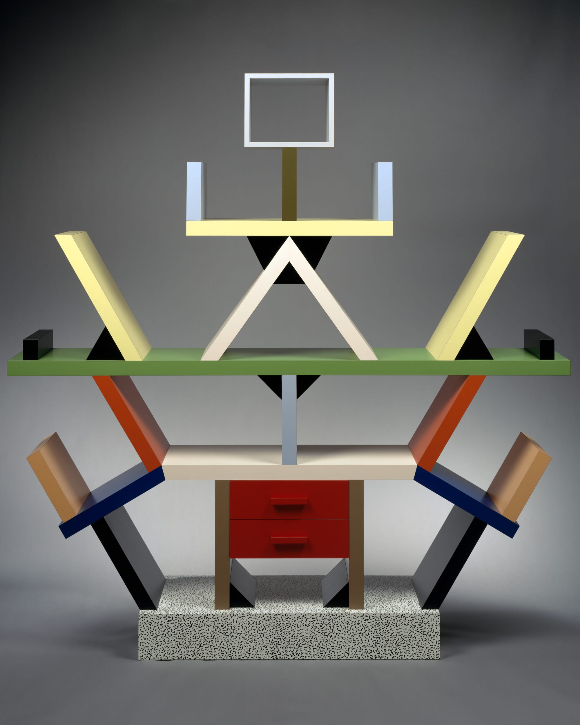Memphis furniture, like the Postmodern movement itself, paired high with low, ancient with modern, highly skilled woodwork with mass-market Formica. The Carlton Room Divider—perhaps the mascot of Memphis—was built to house books, but it hasn’t got a right angle anywhere. (Sottsass remarked that books always seem to lean to the side, anyway.) It’s just this sort of gesture that makes it seem as though the eye-popping quality of his aesthetic is a red herring, and that the real “wow factor” in his work is that his choices make us question what we thought we knew about ordinary things: the quality of materials, environments, typewriters, bookshelves. Tugging at the root of how we live and interact with the objects in our lives, as opposed to just decorating their surfaces, is an act of radical design, indeed.
