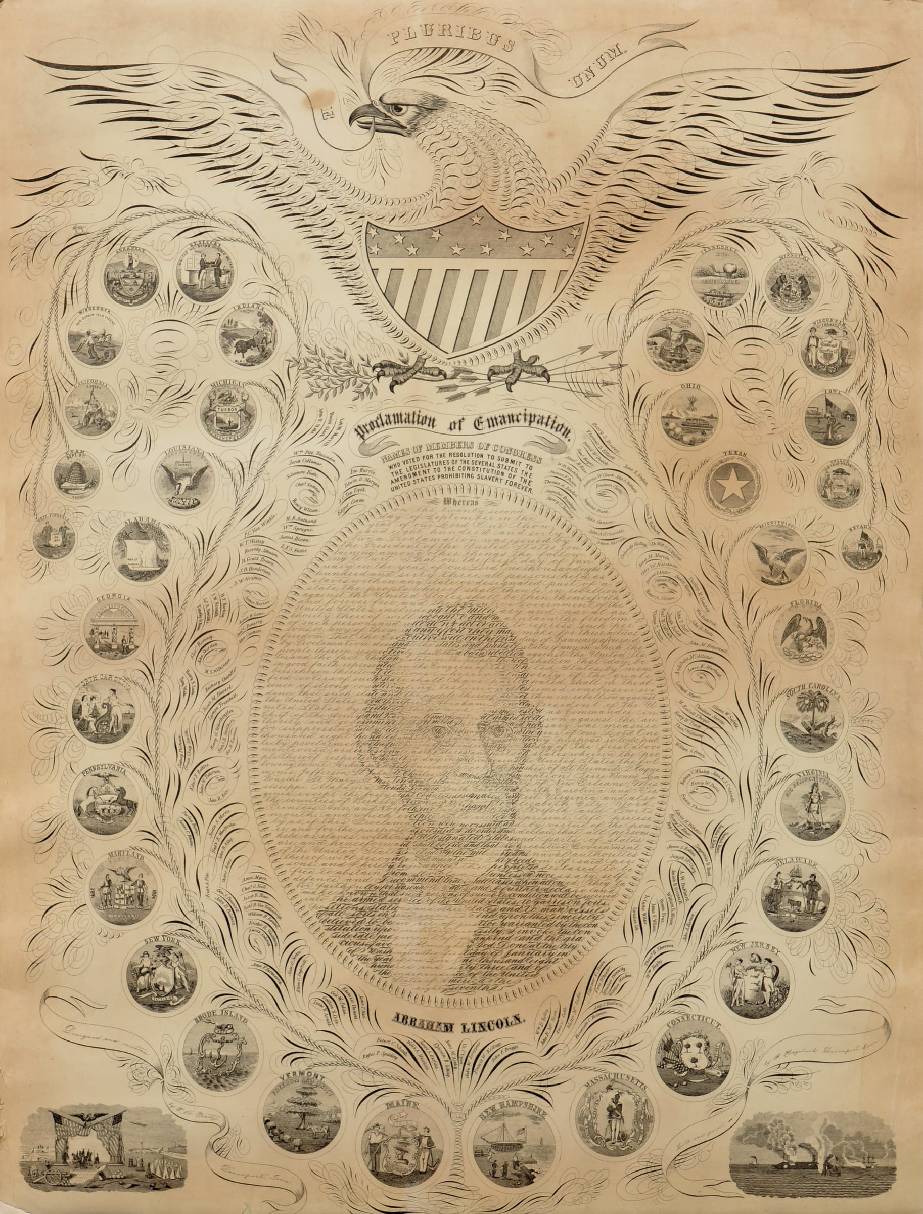 Calligraphic broadside of the Emancipation Proclamation with highlighted portions depicting Abraham Lincoln, surrounded by cartouches representing the states surmounted by an eagle (image courtesy Skinner Auctioneers)