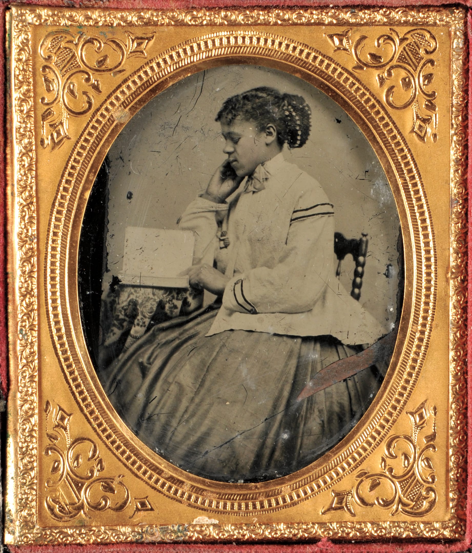 Cased tintype of an African American young lady reading a book (image courtesy Skinner Auctioneers)