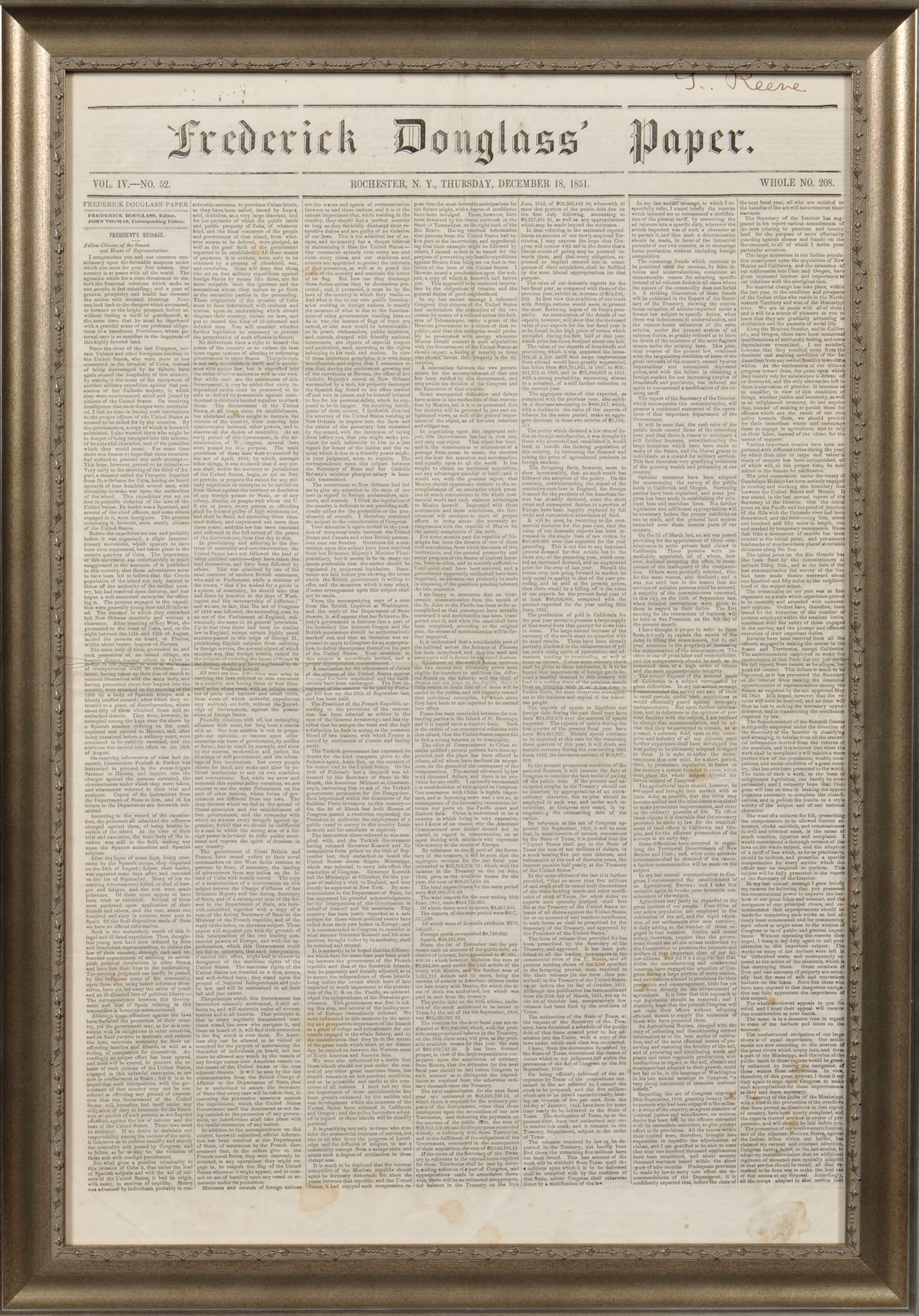 Frederick Douglass’ Paper, December 18, 1851, framed (image courtesy Skinner Auctioneers)