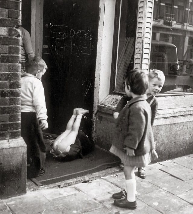 In “Borgerstraat, Amsterdam” (1960), the image is of a recessed area of a building façade featuring two doorways that form a V. The view is from an angle, so that we see only a slice of the space. All the visible protagonists are children. A girl seen in profile is looking into the doorway; she forms with the edge of a wood-framed store window that divides the photograph about a third of the way across, starting from the right side. A boy is standing behind the girl, looking over her should at the photographer; the look on his face is surprised, mirthful and conspiratorial.
