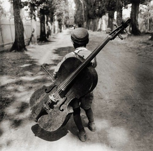 Besnyö had less lofty goals, but that doesn’t mean her photograph is less powerful. We see the boy from behind, carrying his only means of survival. He seems to be completely on his own, with no family or loved ones. The cello’s diagonally oriented strings fold a formal element into the photograph, dividing it into two triangles and endowing it with an emotional distance. We cannot see the boy’s face, which suggests that we might intuit his plight, though we will never know it.