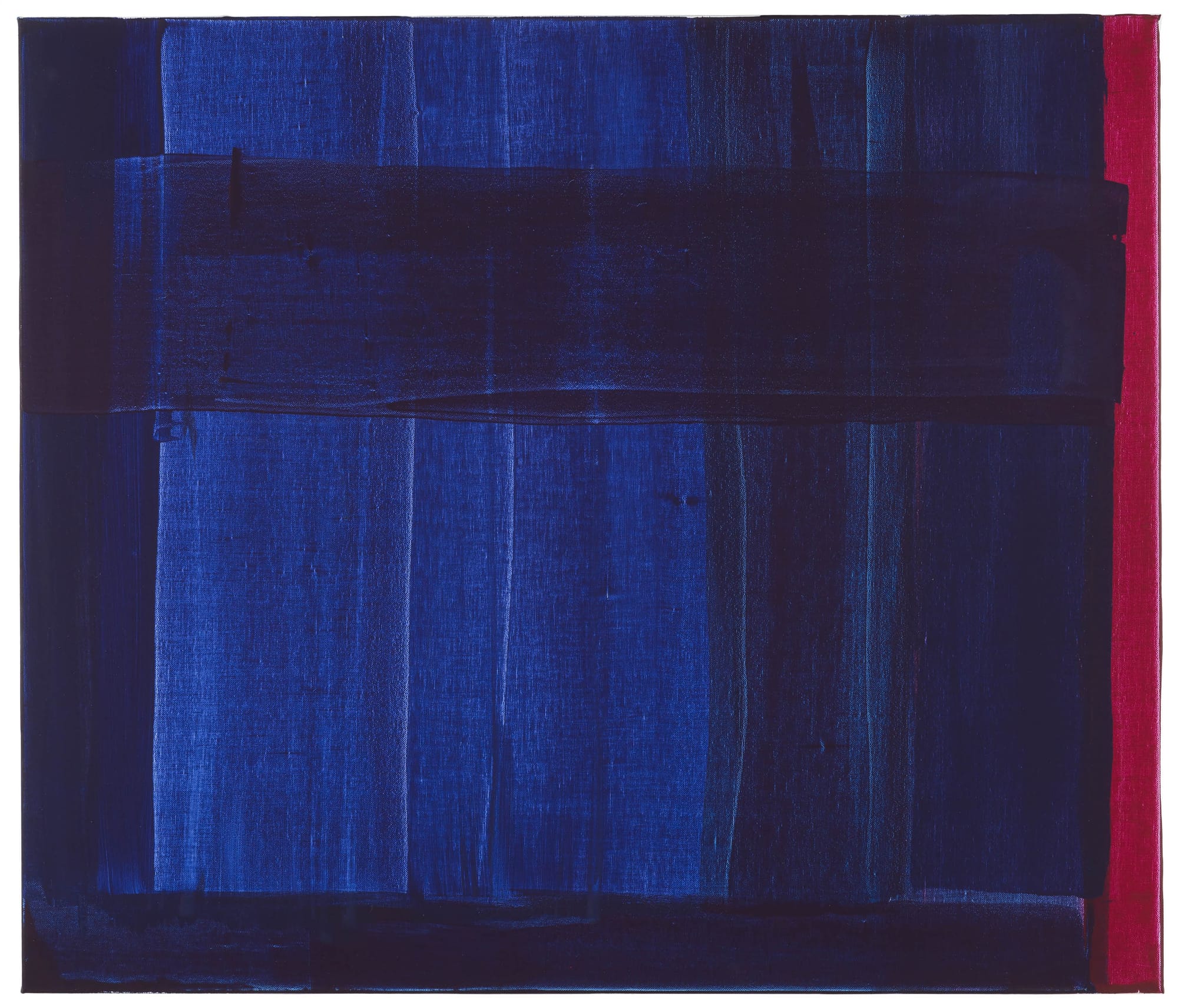 “Eve” (2018) is more subdued. Apart from the narrow strip of red on the right hand edge, dark blues and purples predominate the canvas. The title suggests at least two readings. Perhaps the most obvious is its reference to Adam and Eve. The painting’s red, like the apple of yore, beckons the eye, but there are far more compelling issues in the bulk of the painting. Across the left and bottom edges are wide, deep blue lines; another wide line just below the top seems part of the same family. A thinner wash of paint coats the gap between these lines, the linen almost peeking through in some areas. It becomes clear at this point that Fugazzi has reimagined one of the common chestnuts of painting, from Romanticism onwards, the sky at sunset. Without the title “Eve” the painting would be something else entirely.