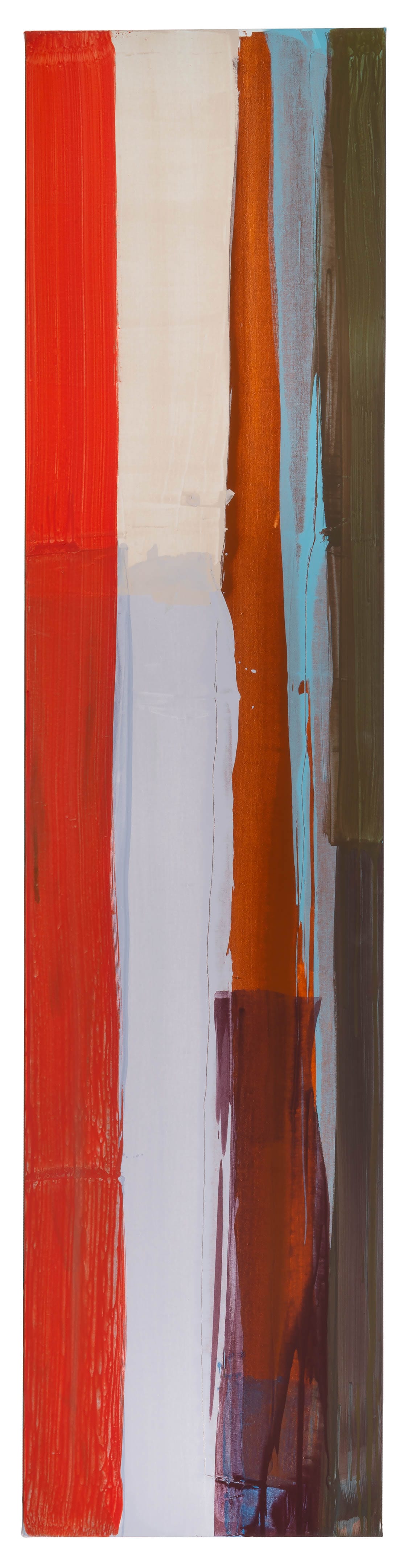 “Blinds” (2018), like “Bark,” is not interested in replicating its namesake in paint. The composition and use of color encourage us to perceive what could be a set of Venetian blinds as a chromatic range of yellow to blue to red, viewing the linear “blinds” as modular and inconsistent. These works seem to ask: What if we saw things this way, as a means to more deeply engage us in looking at our environments?