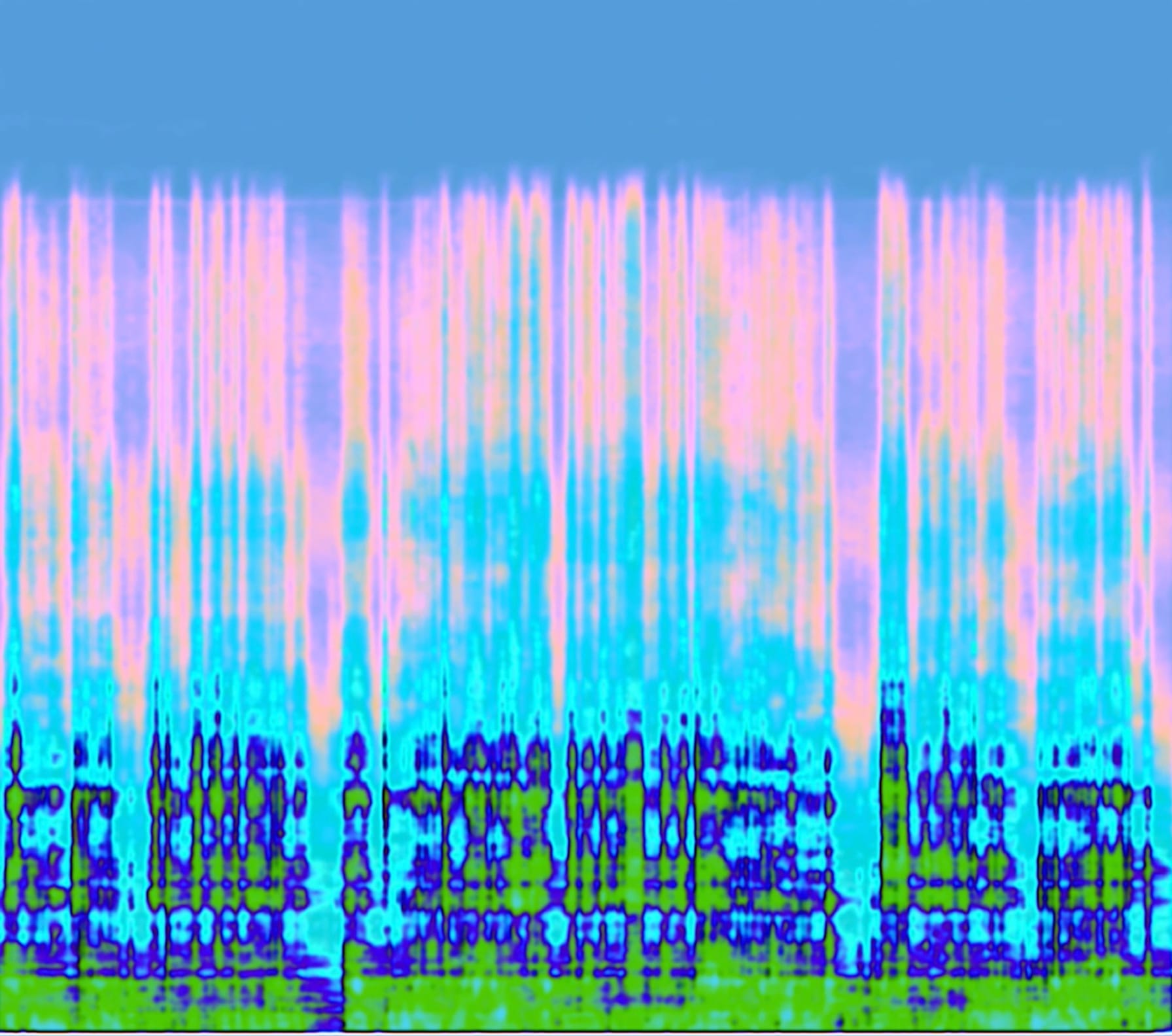 The most stunning — and timely — piece in the show is Behnaz Farahi’s “Unveiling,” produced last September in response to what were then emergent feminist protests in Iran. The video starts with a feminine, cloaked figure in gold and turquoise disintegrating into a swarm that expands and reemerges into an image of the artist before scattering again.