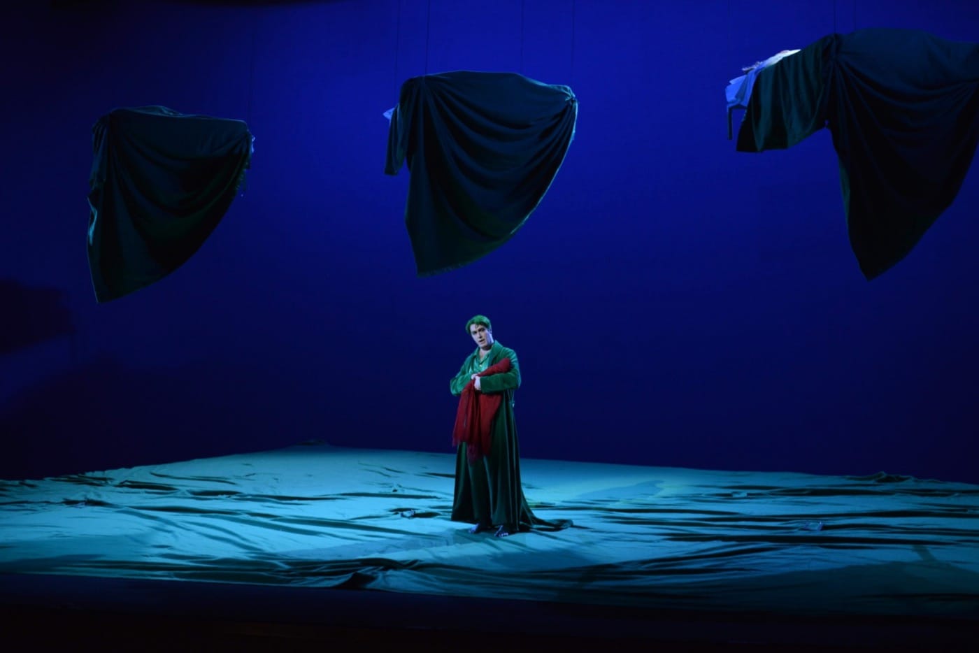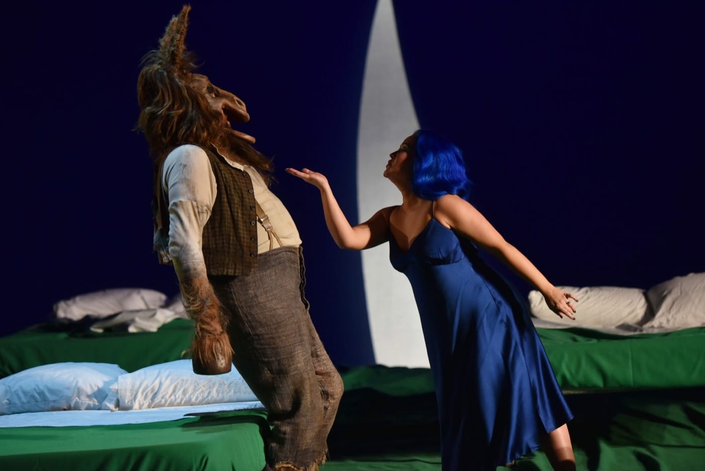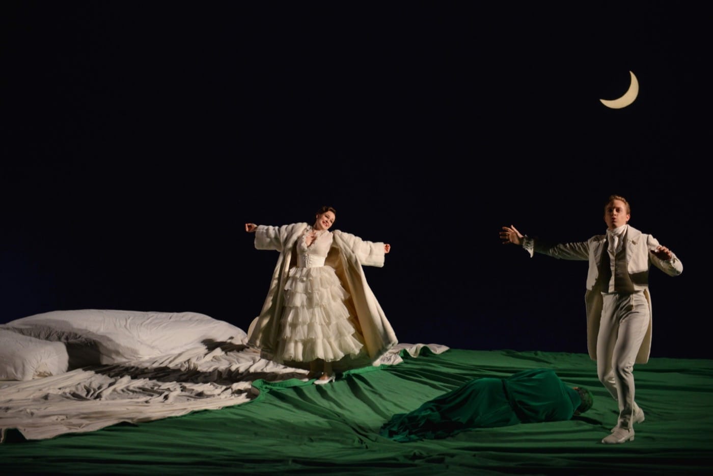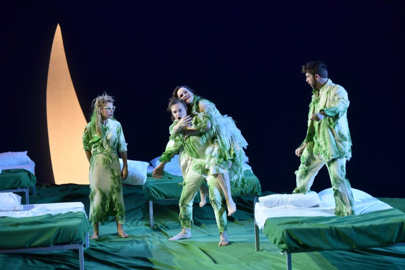 Rather than sticking to a literalistic depiction of the woods of Fairyland, Carsen sets Shakespeare’s beloved story in a more symbolic land of beds — in the first act on a huge and inviting one, in the second and third on a series of smaller ones that allow the characters to switch places in various couplings. In an opera that traffics heavily in sleeping, dreaming, and less-than-subtle sexual suggestion, the bed imagery on stage shows a wry and thorough understanding of the text. Each bed has a green cover to evoke the forest setting, and in a brilliant detail of costuming, the Athenian characters, dressed all in white, acquire more and more green stains on their clothing as the opera goes on, hinting that they have spent considerable time lying down for various purposes.