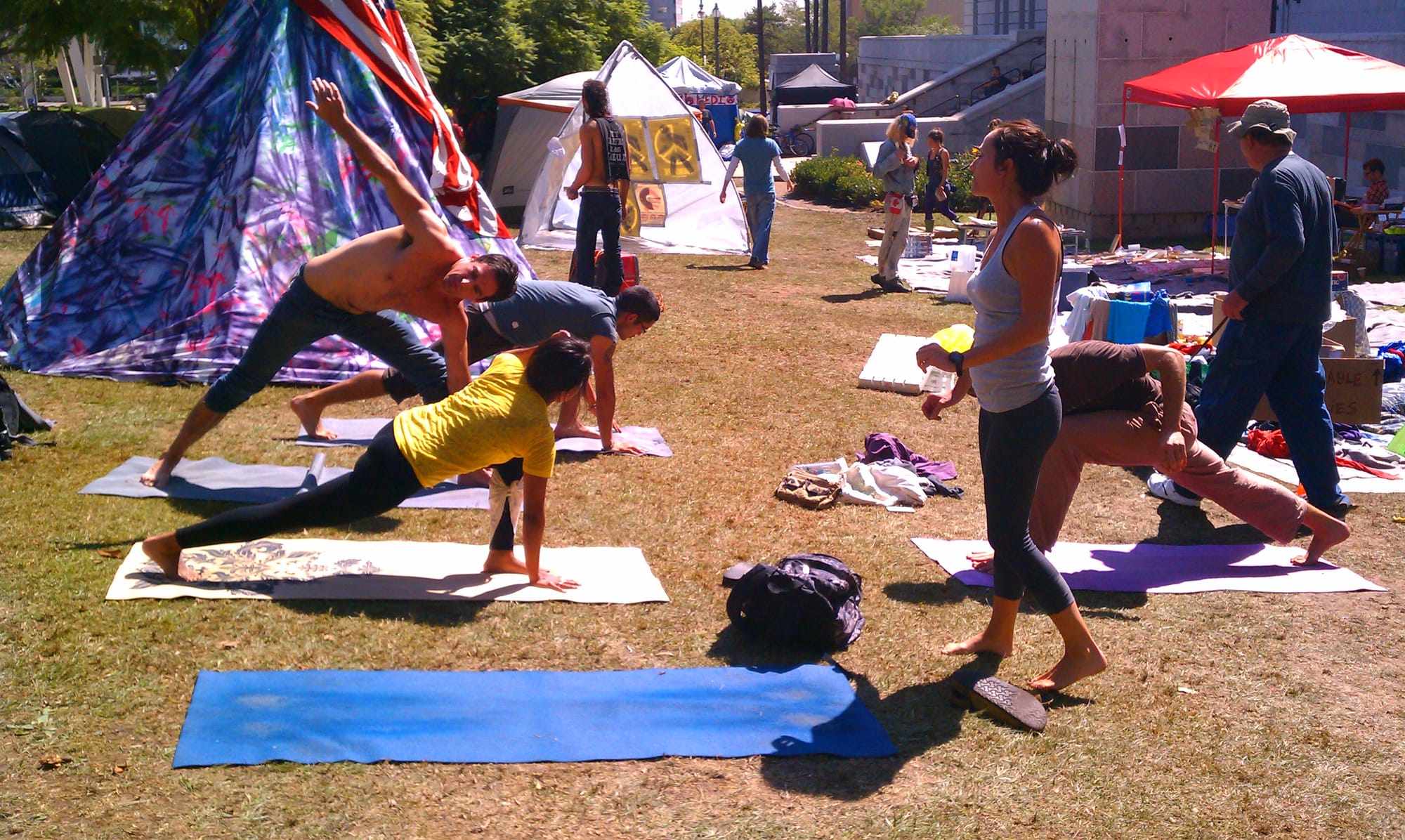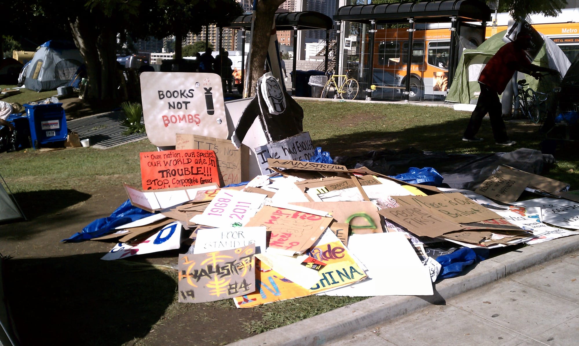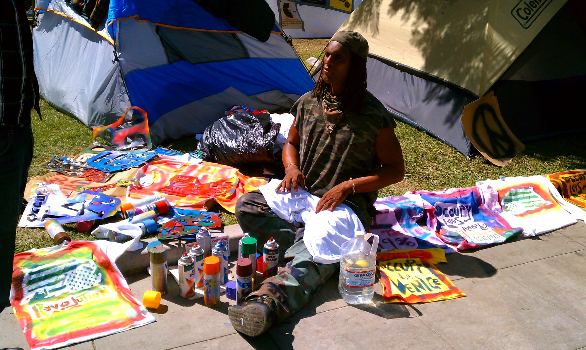 Beyond formal actions organized by committee, occupiers kept themselves busy by painting signs, making T-shirts, playing music or practicing yoga. The scene in Los Angeles remains peaceful and diplomatic, and most occupiers would like to keep it that way. As protesters held signs along busy intersections, passing motorists honked their horns in support. For the first time, the noise of cars in Los Angeles sounded comforting rather than hostile.