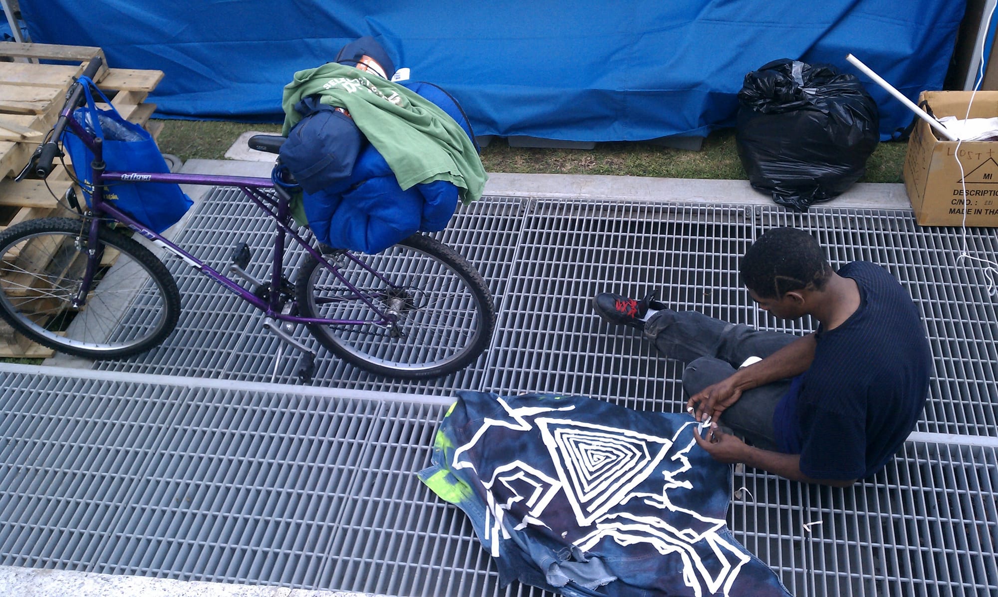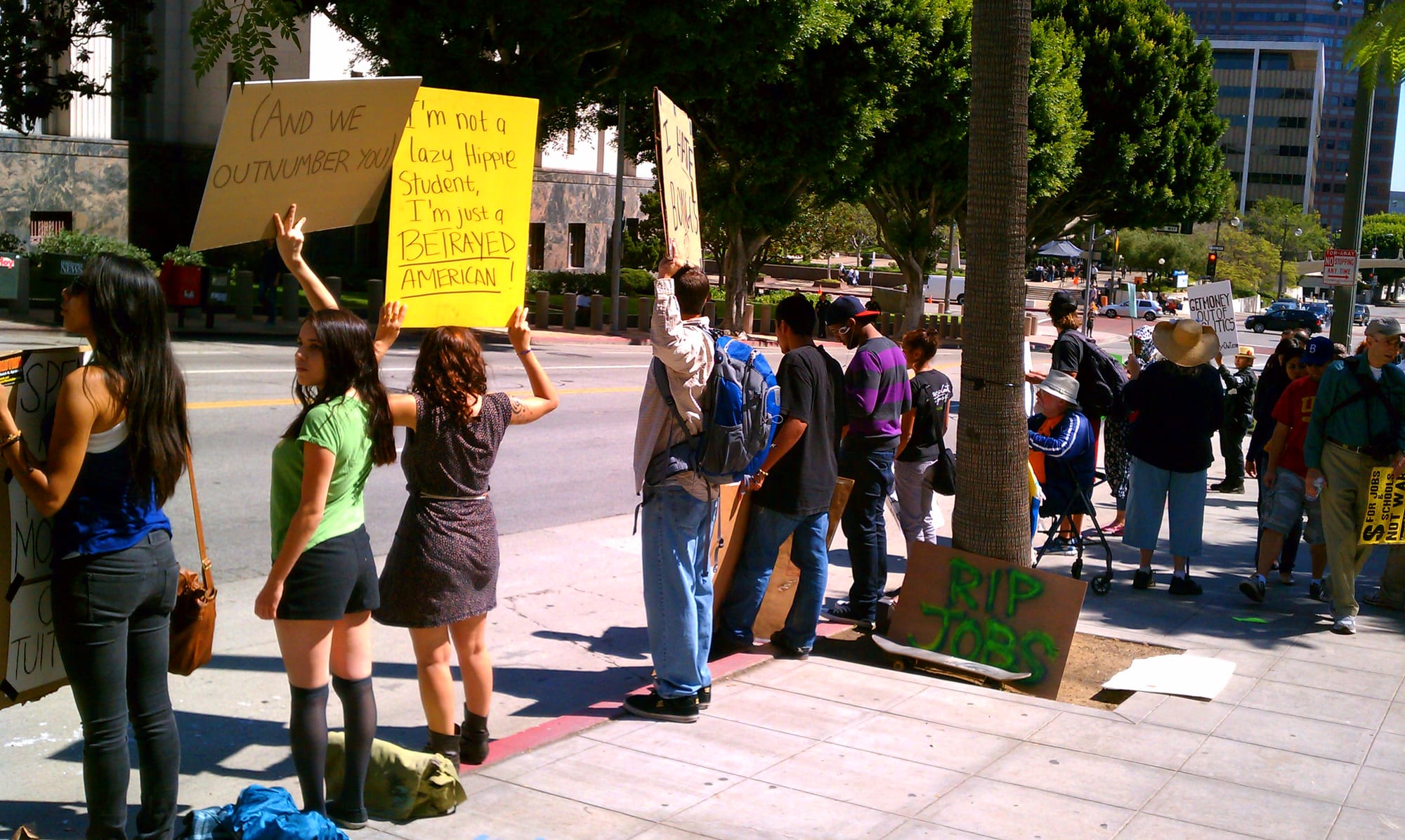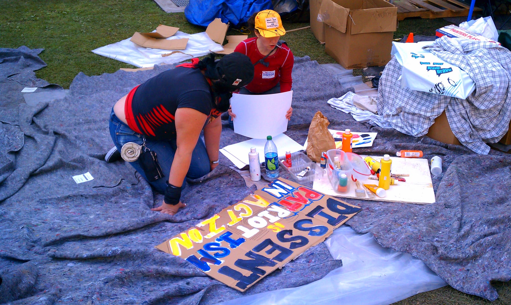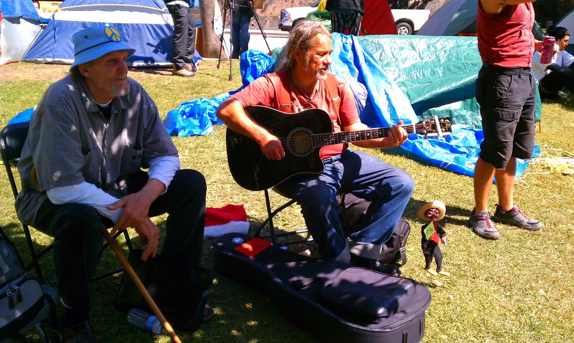 Beyond formal actions organized by committee, occupiers kept themselves busy by painting signs, making T-shirts, playing music or practicing yoga. The scene in Los Angeles remains peaceful and diplomatic, and most occupiers would like to keep it that way. As protesters held signs along busy intersections, passing motorists honked their horns in support. For the first time, the noise of cars in Los Angeles sounded comforting rather than hostile.