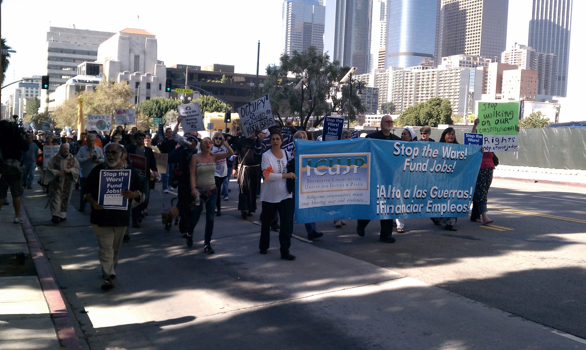 On Friday morning, an anti-war protest led by the Interfaith Communities United for Justice & Peace (ICUJP) converged with Occupy LA and completed its march at a nearby federal building. Shortly afterward, an unrelated visit from Dr. Cornel West attracted a throng of occupiers and cameramen in front of the steps of city hall.