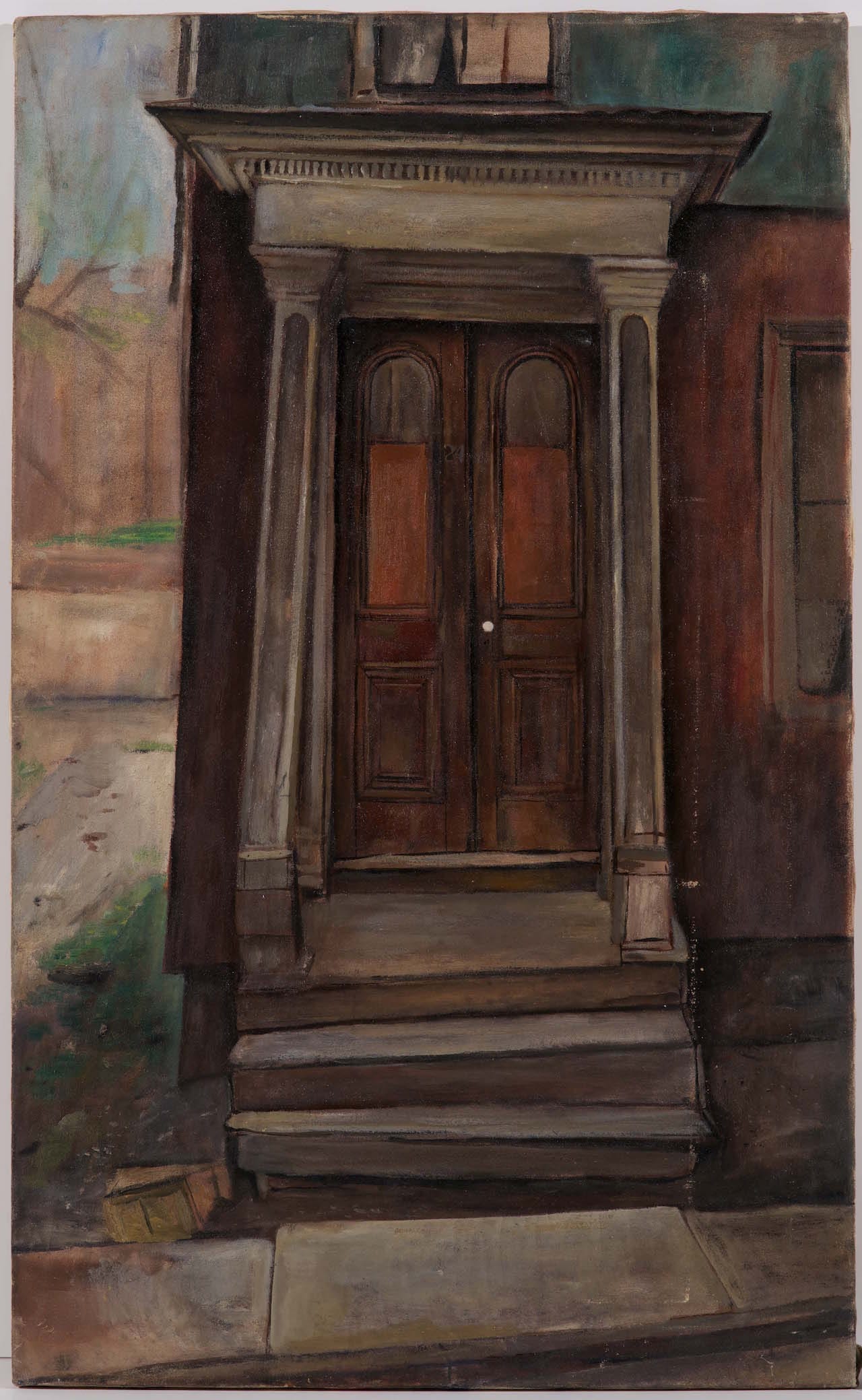For instance, in the bucolic landscape “Grain Elevator, Oradell” (1940), a telephone pole, leaning on a diagonal, dominates the center of the picture, conspicuously dividing the grain elevator’s deep red façade, which is symmetrically placed at an angle to the viewer. Unadorned grayish windows on opposing sides of the elevator shaft come off as distinctly gnomic formations, while the naively painted green landscape and cloud-filled blue sky seem partitioned into neat grids.