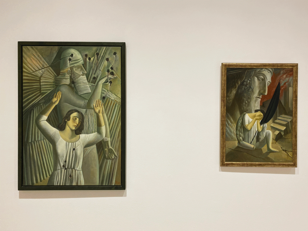A pair of oil paintings by Basra-born artist Afifa Aleiby, who now lives in the Netherlands, evoke the Soviet tradition of monumental art (she studied at the Surikov Art Institute in Moscow). In both paintings — “Gulf War” and “War Painting” (both 1991) — wounded women figures are set against the background of ancient relics, at once mourning the killing of Iraqis and the destruction and looting of the country’s cultural heritage.