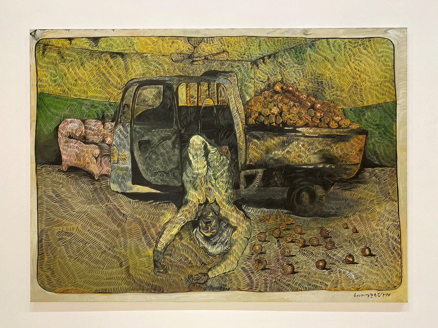 Another exiled Iraqi artist living in London is Dia al-Azzawi, who’s rightly considered one of Iraq’s greatest living artists. The 81-year-old painter and sculptor is represented via several works in the exhibition, from his diaristic mixed-media Dafatir (Arabic for notebooks) to his monumental, “Guernica”-style painting “Mission of Destruction” (2004-2007), which sprawls over a large section of the museum’s third floor. The latter depicts a massacre: American soldiers on one side of the canvas point weapons at a chaotic mass of murdered, injured, and panicked Iraqis on the other. Here al-Azzawi, once known for his use of vibrant colors, switches his pallet to somber, muted tones, signifying the darkness that has befallen his country amid the war.