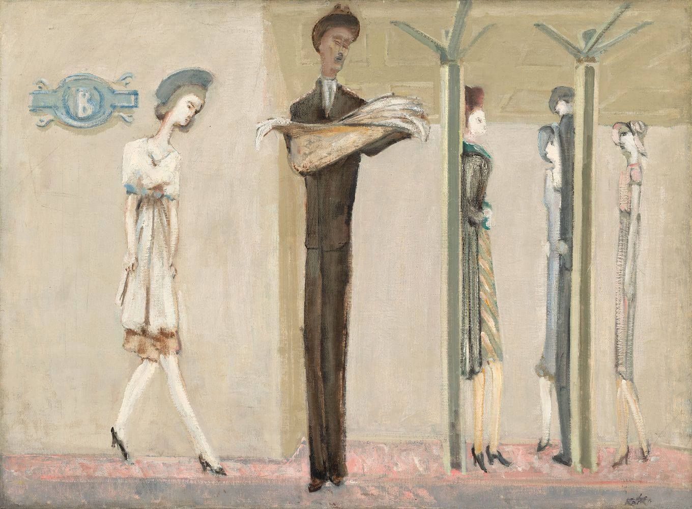 Only the first part of Crow’s account is really visually testable within this exhibition, which doesn’t contain many of the large dark late paintings. In “Untitled (Two Women at the Window)” (1937), the women stand within a frame. And in “Contemplation” (1937/8) a single figure looks off to the side as if in contemplation, much as, in one studio photograph, Rothko contemplates his abstract paintings.
