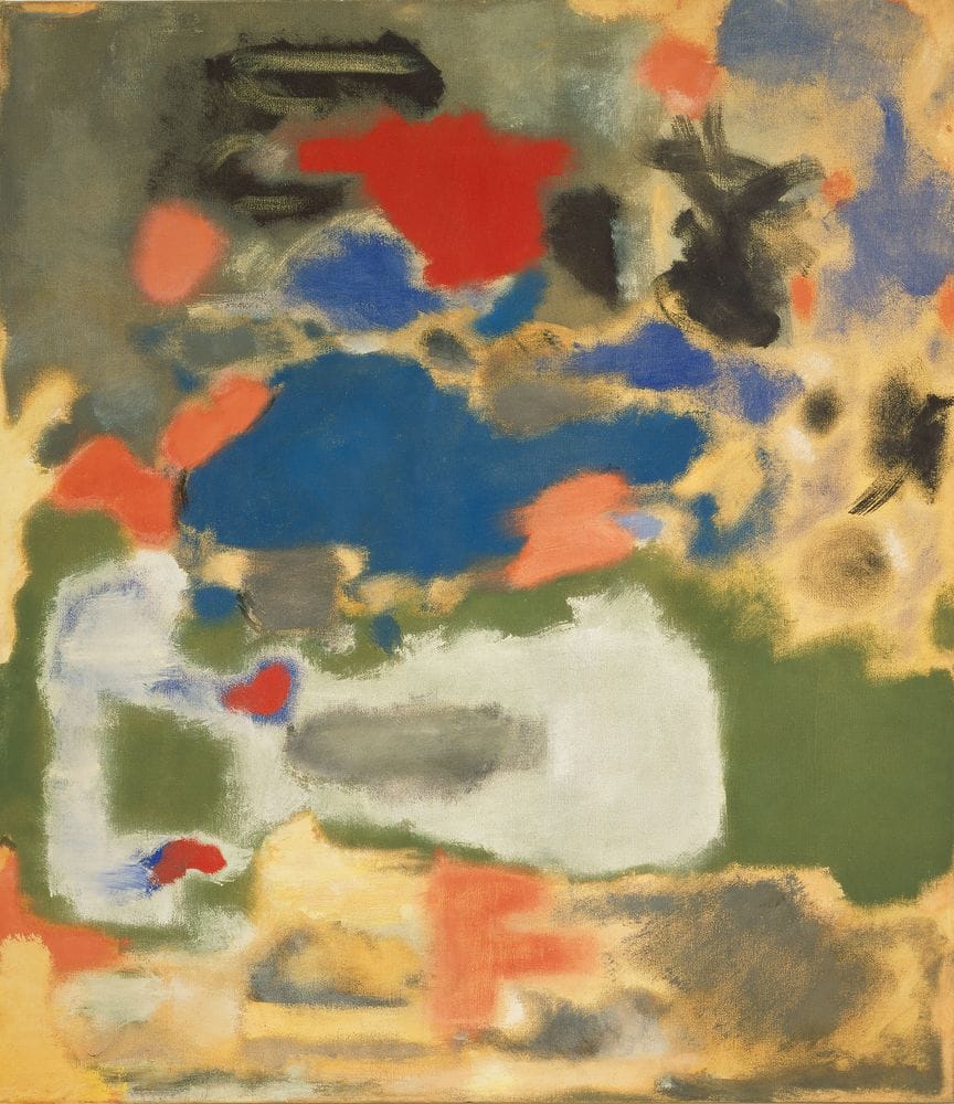 Then “Untitled” (1946), a big painting, with its yellow and red form, makes the transition into abstraction. This intermediate work looks formless, but when we get to “Untitled” (1948), Rothko uses green, blue, and orange forms to more successfully sort out the relationship between “acting” forms and background stage settings. And later that year, when we get to “Untitled (Multiform)” (1948), which floats monochromatic rectangles on a background, we come to a signature-style Rothko.