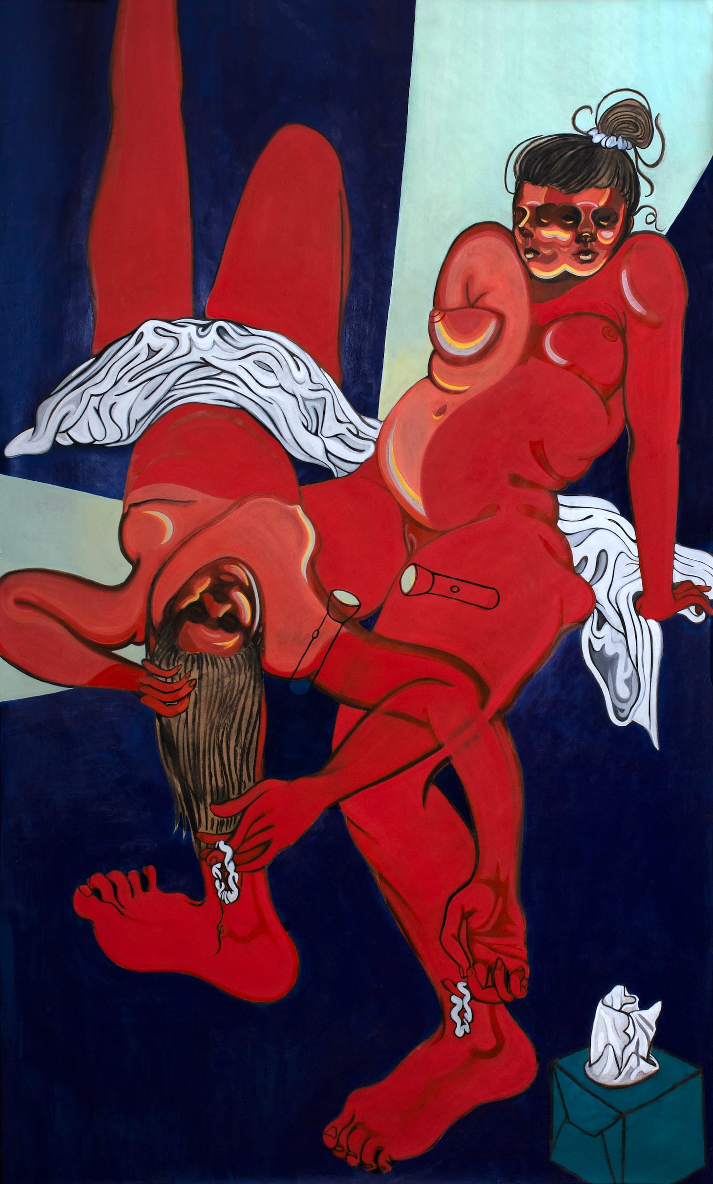 “The female body drips, spills, stains, and folds in on itself; fat gathers, flesh sags, menstrual blood pools. The figures in my work embody this experience in their fluidity, precariousness, and shiftlessness, along with the materiality of paint and ink,” Christine Lyon writes in her artist statement.