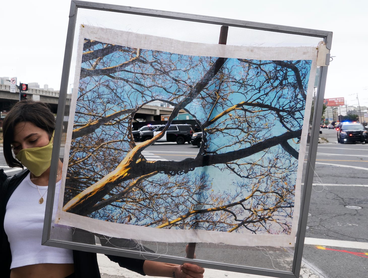“If ‘Daphne’ had been made to be viewed virtually, I would have stopped at the photo collage stage; however, I did not make a photo collage, I made a weaving,” Becker wrote over email. “I spent 36 hours standing at the loom stepping back and forth on a foot pedal while throwing seven to eight shuttles in rotation to render these images in warp and weft.”