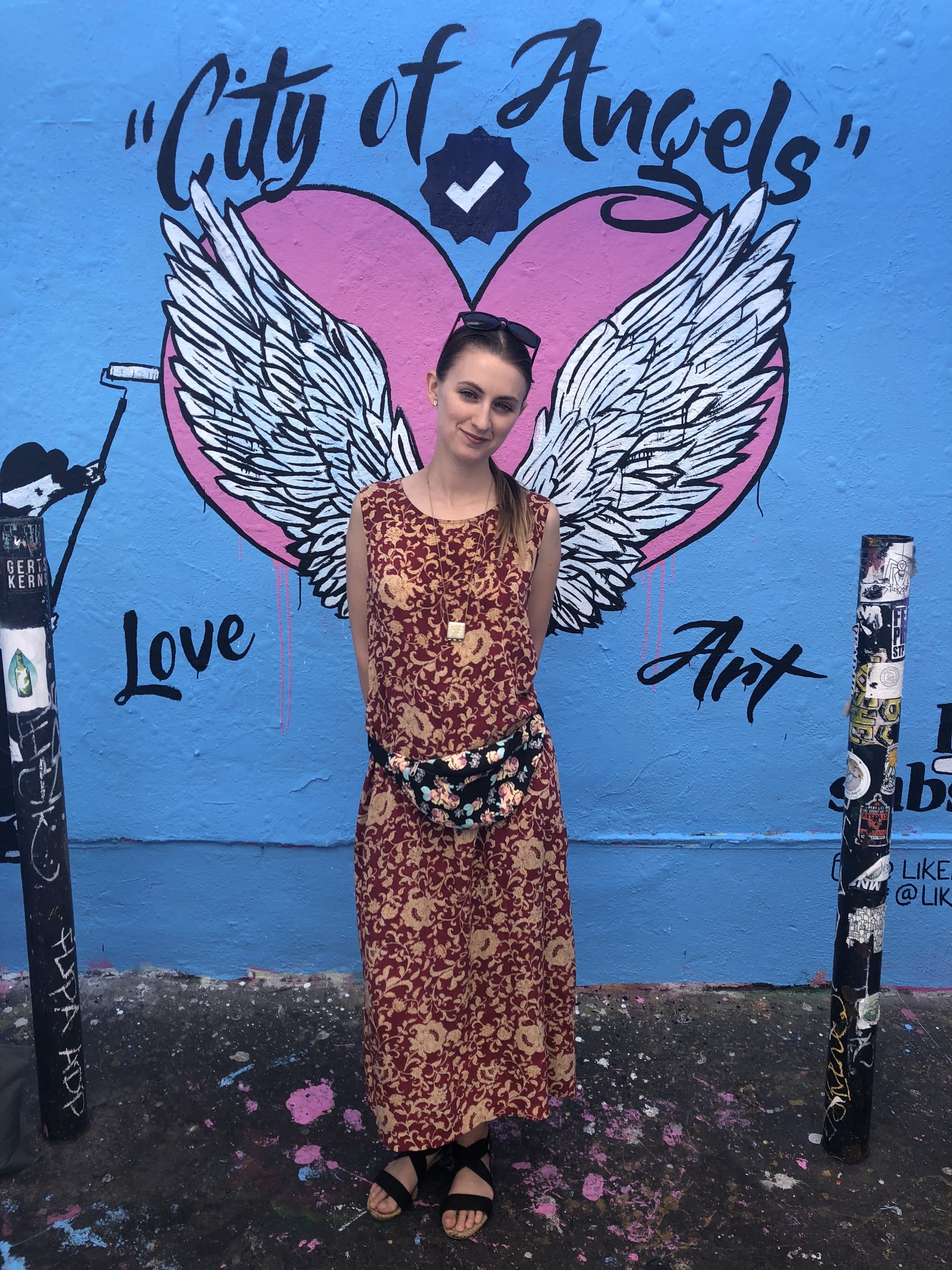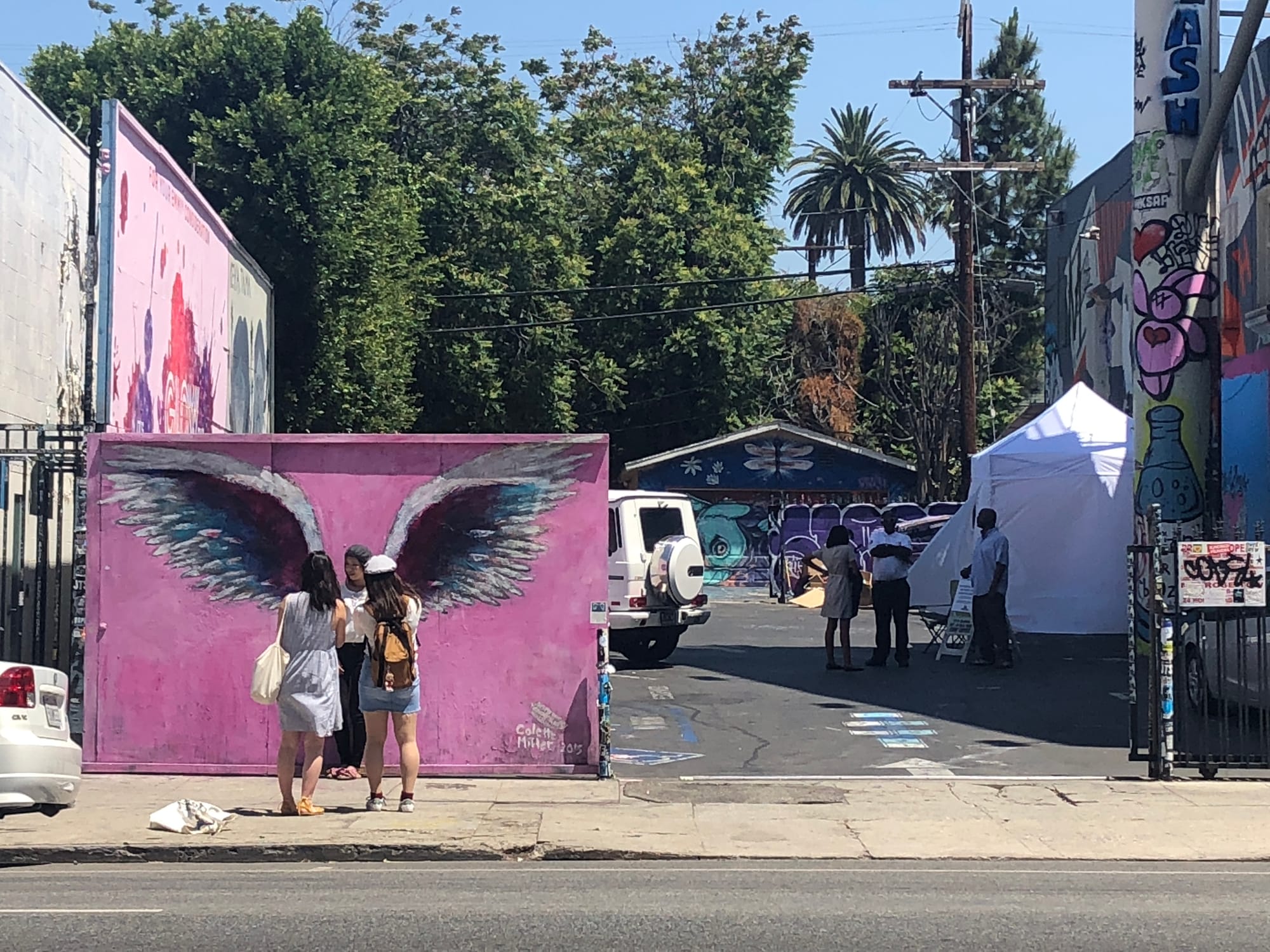 Just around the corner from one of Miller’s murals in Hollywood, where a group of visitors snap non-ironic photos, a cheap white tent covers up another, private mural, designed specifically for and by Like and Subscribe. In addition to angel wings, the commissioned work contains the Los Angeles moniker “City of Angels” in quotation marks, and, inexplicably, the words “Art” and “Love” — not to mention a verified user check designed to go over the poser’s head.