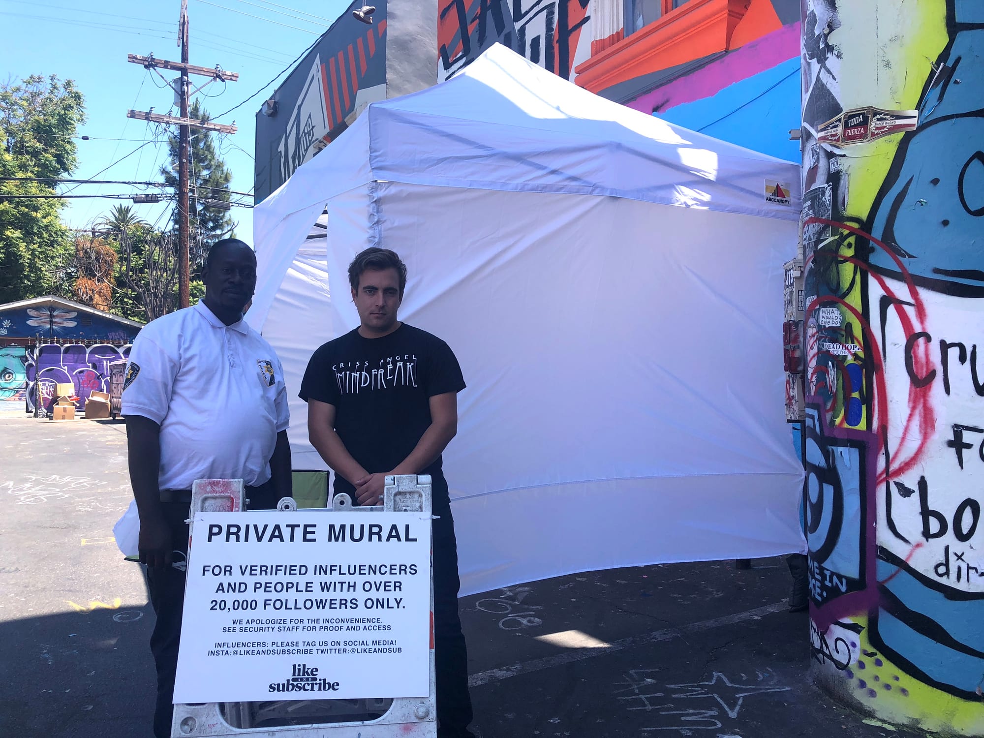 Jack Wagner, one of Like and Subscribe’s producers and writers, said his goal was “to make the most Instagram-able mural in Los Angeles … all of the key elements.” Outside, a sign indicates that only “verified influencers and people with over 20K followers” are allowed inside to snap a selfie, a move that has ensured both attention and outrage. Some Twitter users complained about the aesthetics of the mural itself, with one bemoaning that “This is a rip off and mish-mash of Banksy, Shepard Fairey and Colette Miller,” a description which, according to Wagner, is pretty much dead-on. Others targeted the most obviously offensive element of the work: its exclusivity, with posts calling out the stunt as “perfecto capitalism” and “social media gentrification.”