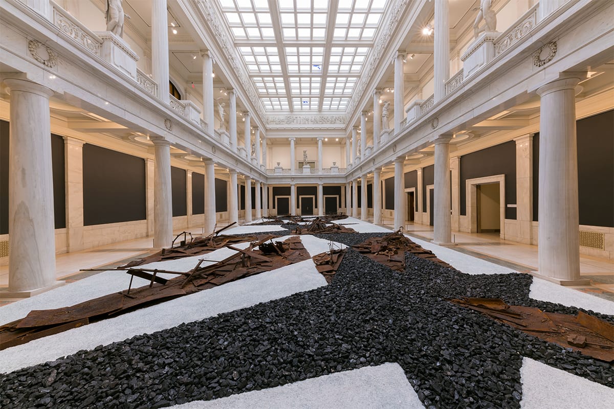At last year’s Carnegie International in Pittsburgh, the artist collective Postcommodity produced a large-scale installation of coal, glass, and rusting steel modeled after Navajo sand paintings. Using the work as a “sculptural graphic score,” local musicians performed their interpretations of the installation over six months, surfacing the local African American community’s history of organized labor and jazz music. Earlier this year, the contested histories of mid-century modernism and Cahuilla tribal territories were the focus of a sonic environment installed by the collective in the Coachella Valley. Using sound and place, Postcommodity mediates the complexities of local histories, cultural heritage, and community self-determination.