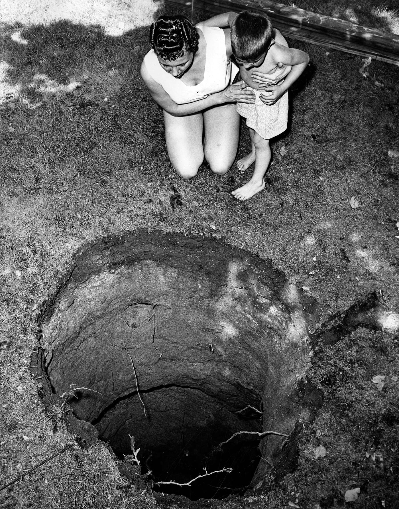 George Brich, “Mrs. Robert McConnell and son Robert Jr. peer into strange 14 foot cave-in in backyard of their home at 216 N. Lincoln St., Burbank. Authorities say they can’t figure out cause.” (June 20, 1960) (Valley Times Collection, Los Angeles Public Library)