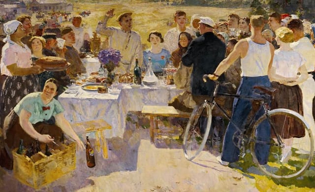 Unless you live in Russia, it isn’t everyday that you get to see a Gerasimov painting up close, since most Soviet Socialist Realist paintings are exhibited in their home country (for the same reason that Gilbert Stuart’s George Washington portraits stay Stateside). The Tretyakov at 10 Krymsky Val has many incredible examples, including one of my favorite pieces of all time, “Collective Harvest Farm Festival” (1937). The painting, which depicts proletariats gathering for a meal after a long day’s work, is extremely powerful. The piece is gigantic — comparable to many of Diego Rivera’s free-standing murals — and the colors are extremely vivid. After viewing the work in person, I can understand why Gerasimov was a popular and respected Soviet painter. His pieces are refreshingly hopeful, cleansing and transforming.
