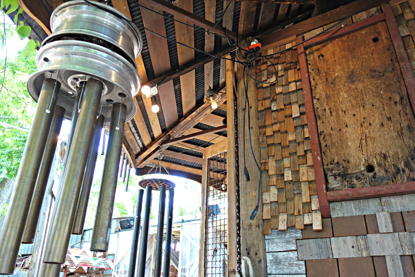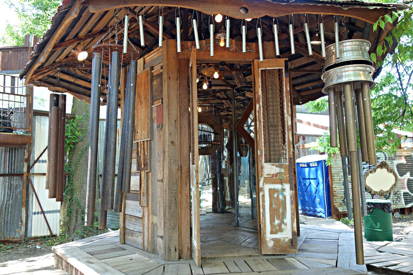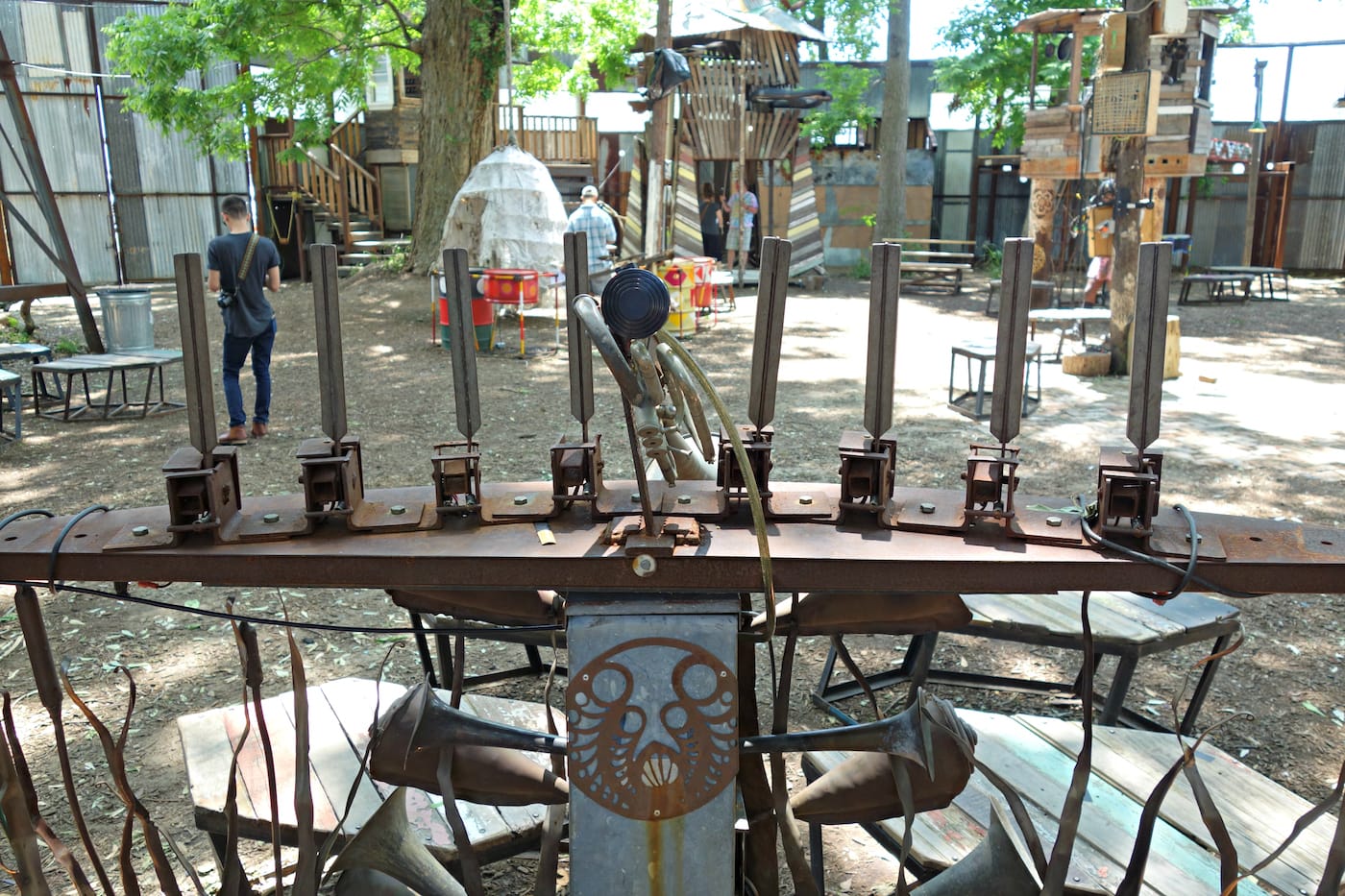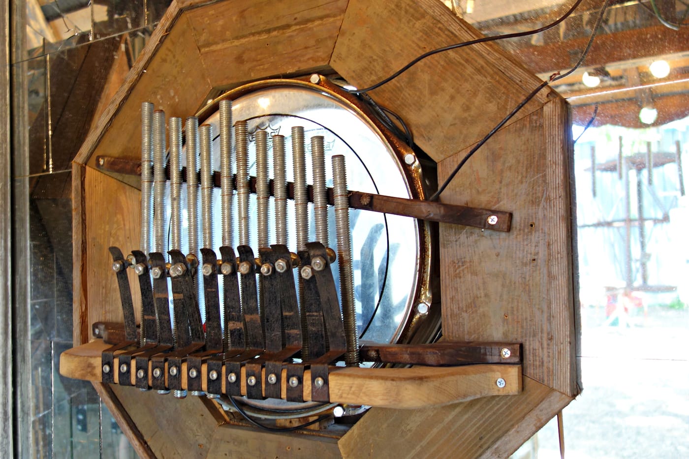 I visited last year in June and September, before the official opening in October, so on a warm Saturday last month, I was eager to check it out during public hours. While the Music Box Village regularly hosts concerts, with recent performances by Nels Cline of Wilco, Solange Knowles, Gogol Bordello, Quintron, Preservation Hall Jazz Band, Thurston Moore, and Will Oldham, during public hours anyone can stop by and explore. An available “Field Guide to the Musical Architecture” offers hints for each of the 11 current interactive sculptures. For example, “pick up the phone, throw your voice” is the direction for Matthew Ostrowski and Nina Nichols’s “Western Electric 2,” which broadcasts your distorted voice from a telephone booth. For the most part, though, you’re left to figure out how to play each house through experimentation.