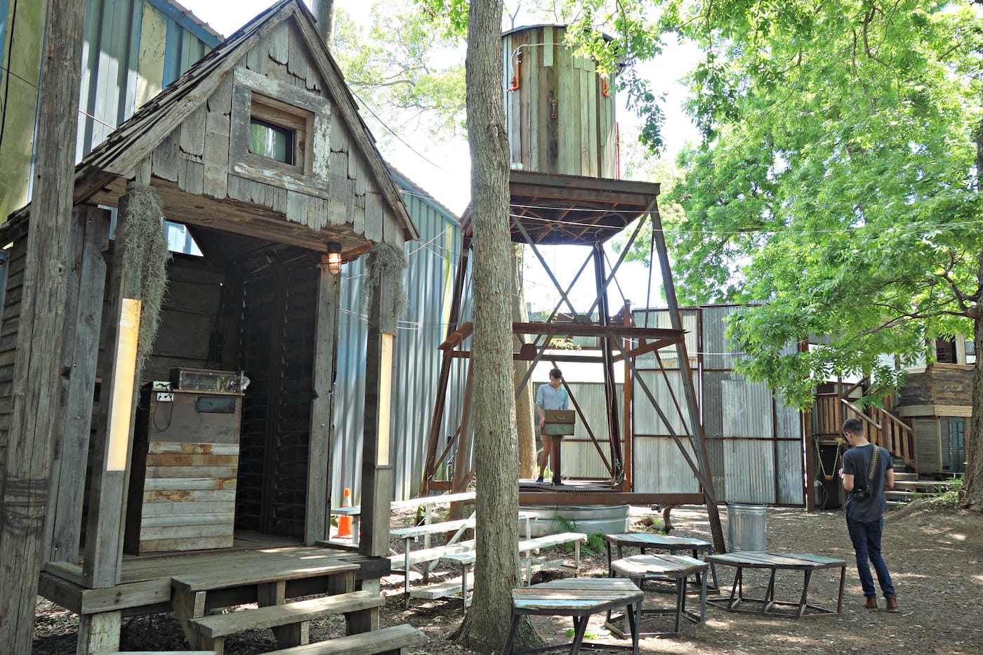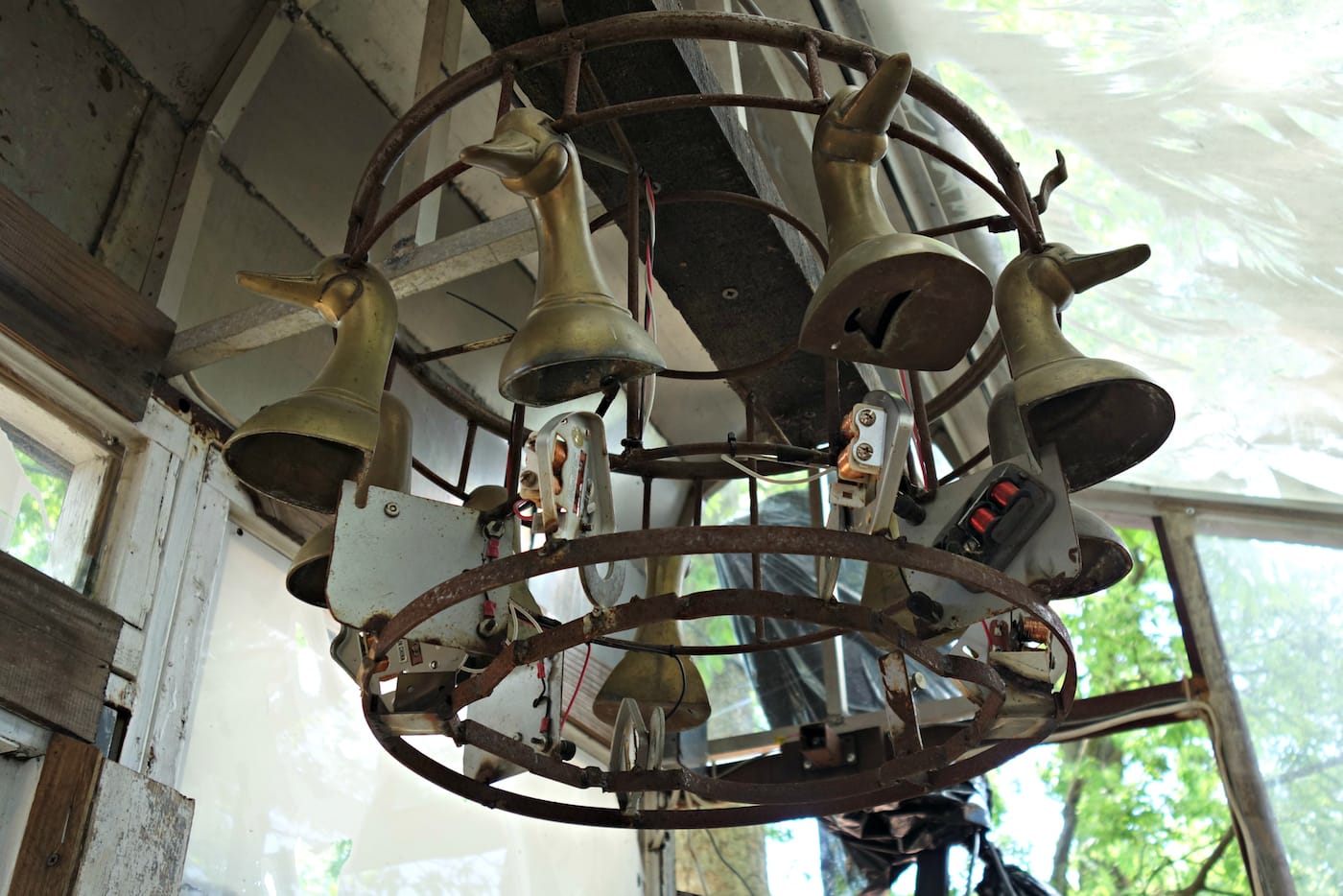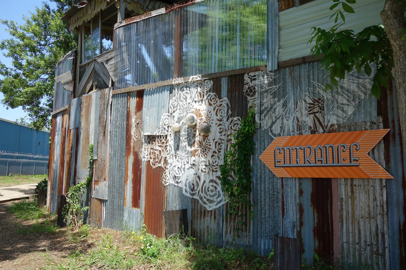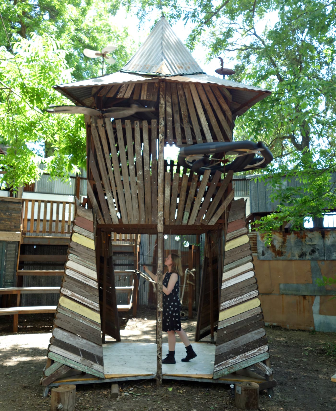 I visited last year in June and September, before the official opening in October, so on a warm Saturday last month, I was eager to check it out during public hours. While the Music Box Village regularly hosts concerts, with recent performances by Nels Cline of Wilco, Solange Knowles, Gogol Bordello, Quintron, Preservation Hall Jazz Band, Thurston Moore, and Will Oldham, during public hours anyone can stop by and explore. An available “Field Guide to the Musical Architecture” offers hints for each of the 11 current interactive sculptures. For example, “pick up the phone, throw your voice” is the direction for Matthew Ostrowski and Nina Nichols’s “Western Electric 2,” which broadcasts your distorted voice from a telephone booth. For the most part, though, you’re left to figure out how to play each house through experimentation.