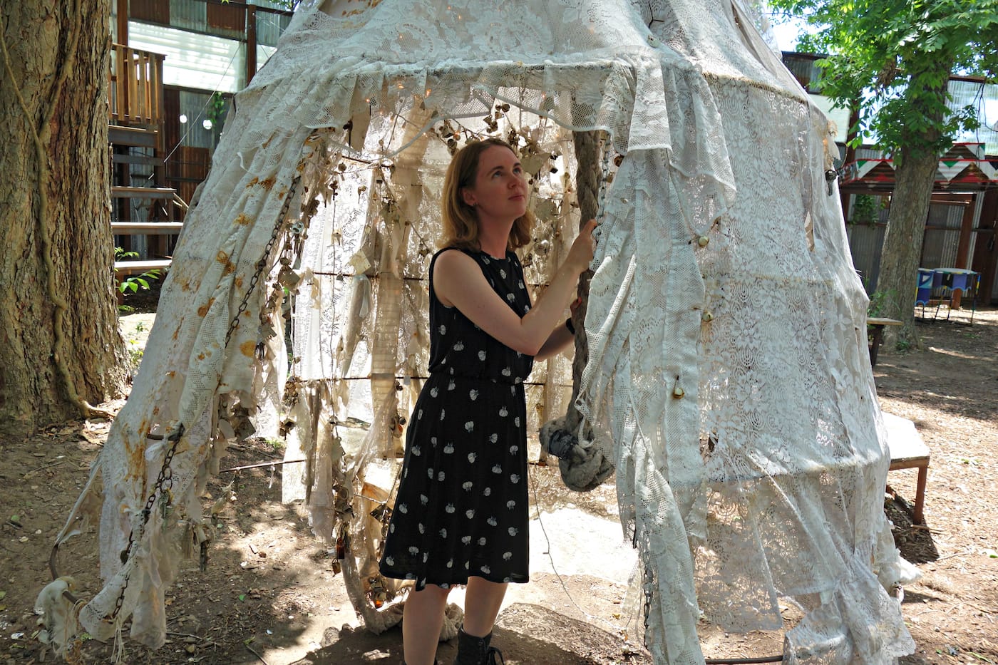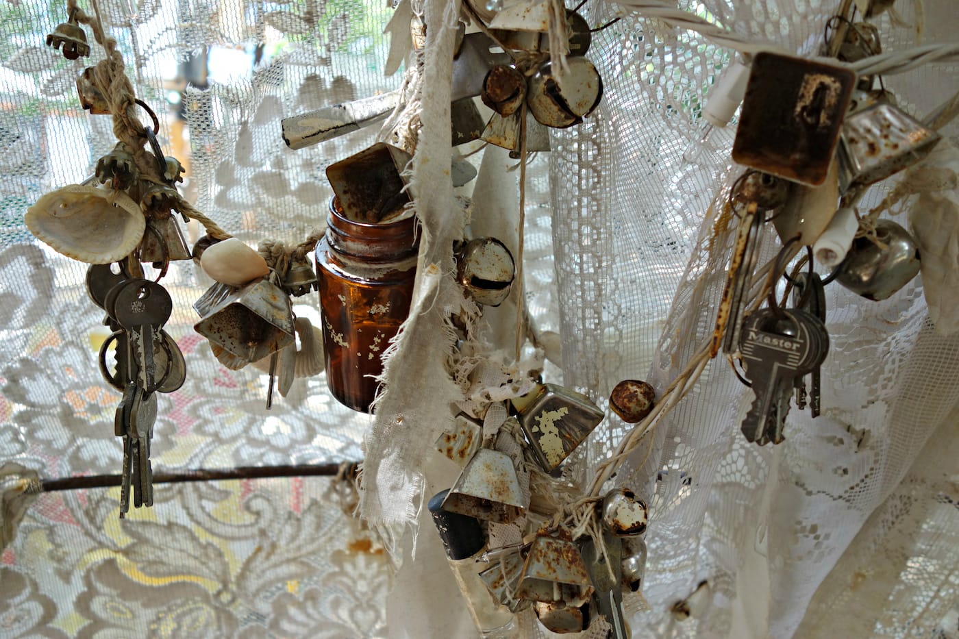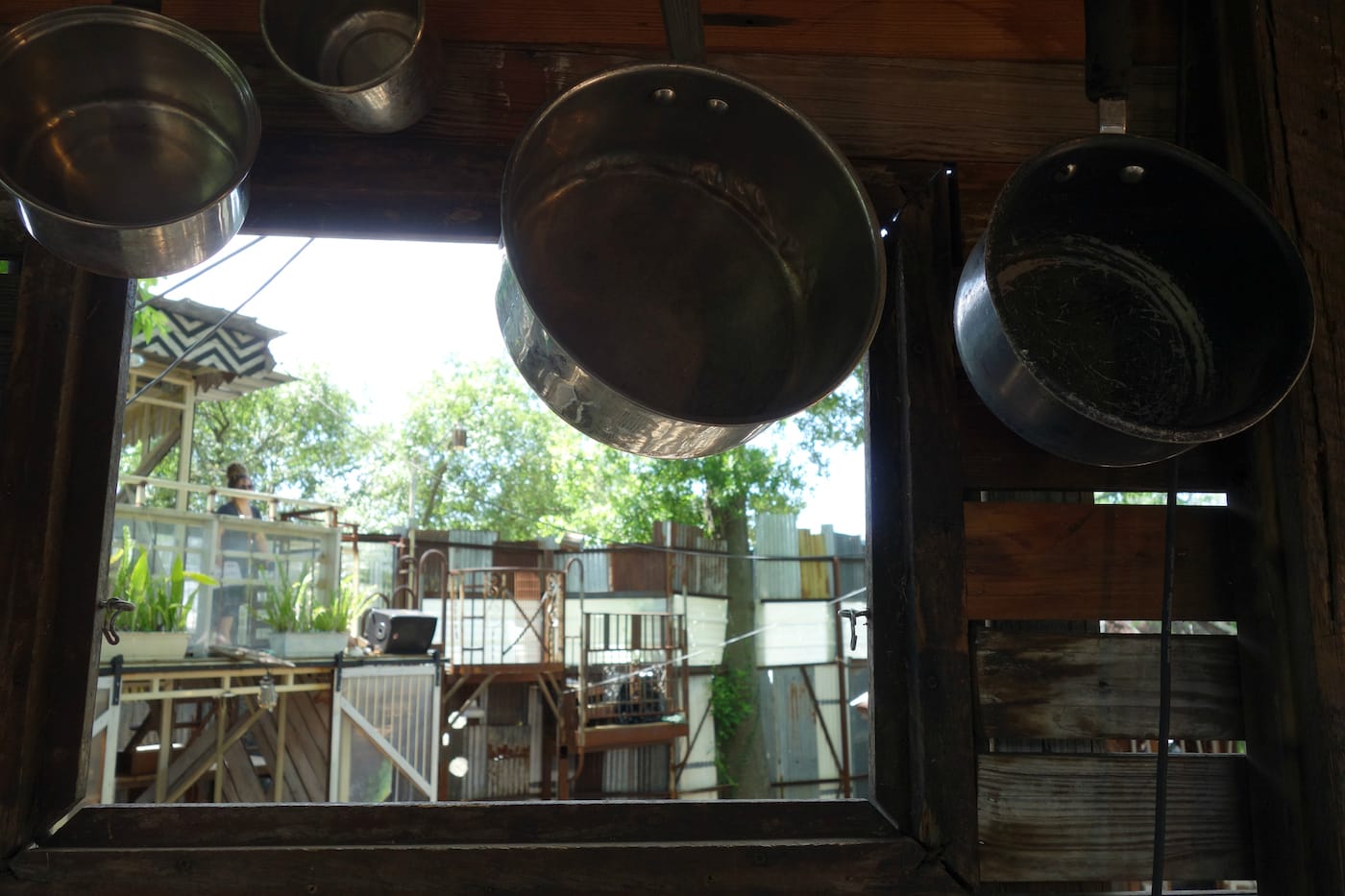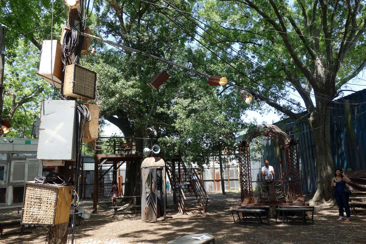 The modulated horns of Devon Brady and LiveWork Collective’s “Syphonium” water tower were inspired by the whistles of boats passing on the adjacent Industrial Canal and trains rolling by on the tracks. From a balcony positioned right below the tree canopy, you can listen to those city sounds mix with the ringing of keys and bells suspended from lace in Angeliska Polacheck’s “Tintinnabulation Station” or the rippling of chimes encircling Ross Harmon’s “Bower’s Nest.” When kids are enthusiastically beating on Carl Joe Williams and Luther Gray’s “Inter-relational Messages and Patterns” barrel drums and the train is roaring by, it’s not exactly melodious music. But it is music with a powerful sense of place.