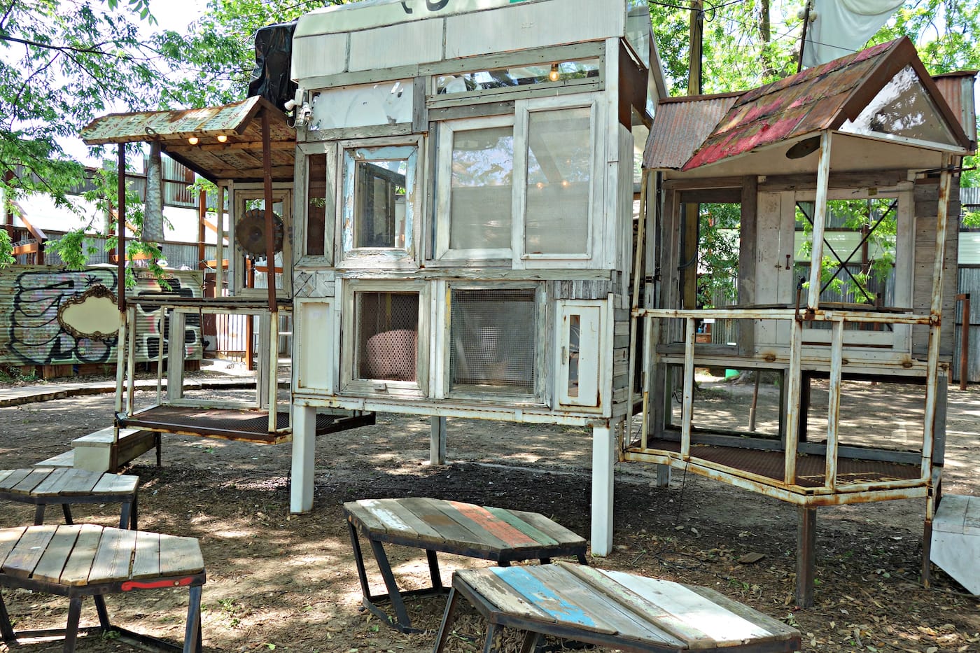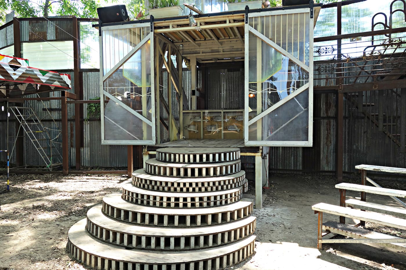 The houses at the Music Box Village are not made of anything precious, just salvaged wood, found objects, and cleverly incorporated synthesizers and subwoofers. In its first temporary iteration, the project involved a collapsing Creole cottage brought to life by inventive artists working in a post–Hurricane Katrina New Orleans. Reuse, collaboration between artists and visitors, and an interaction with this part of the city encourage a community harmony.