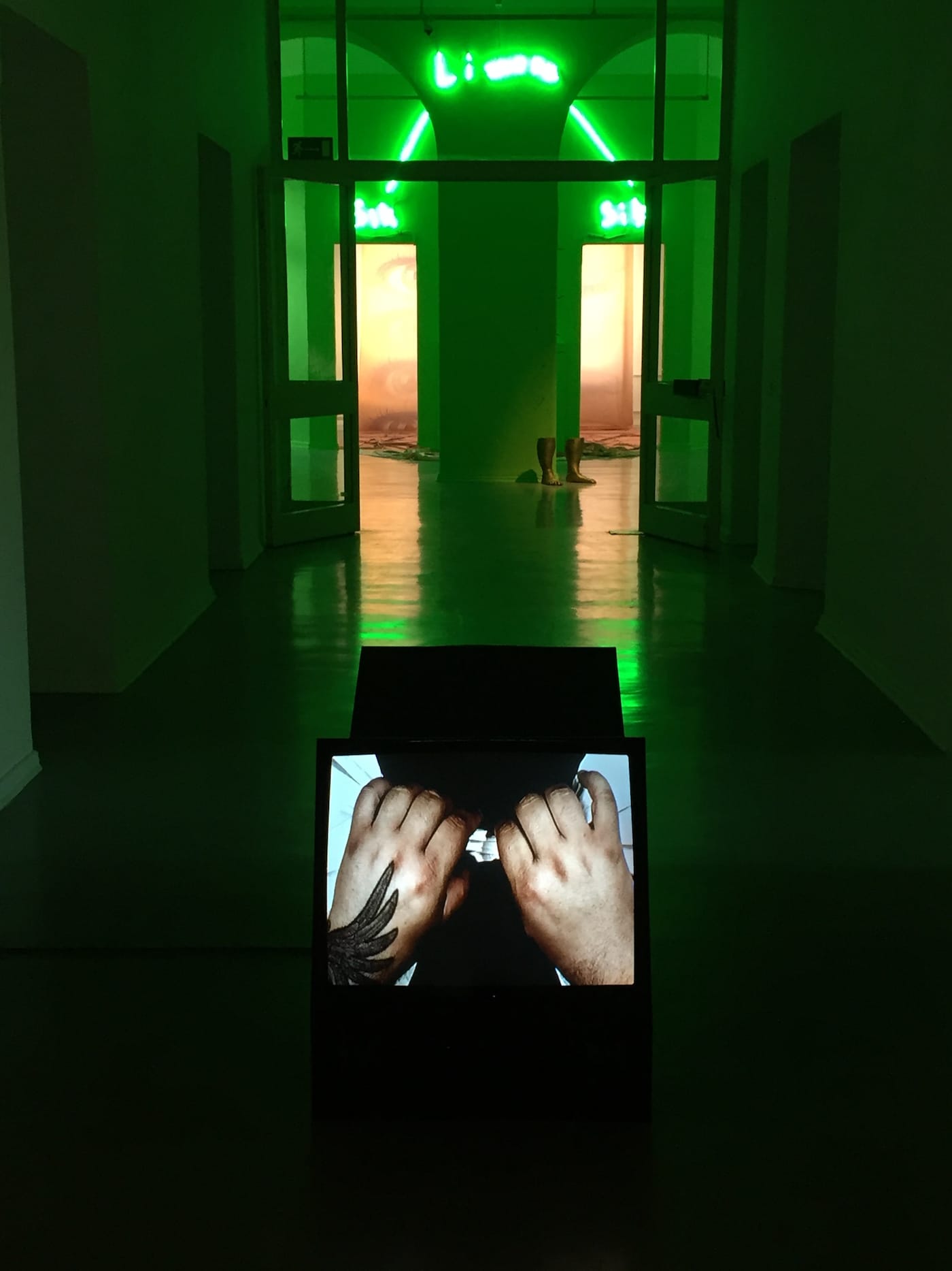 The artist’s interest in mythological content is an engaging element in his work, revealing the fluid interaction between an individual’s subjective construction of identity and the construction of history as an “official” narrative. Myth is explored through a contemporary perspective, comprehended as the foundation for social dynamics and subconscious thought processes. For instance, in “Long Live Your Balls” (2017), an installation using two different rooms at the end of the hallway, lead sculptures and neon lights are put together, while a poster portrays a blown-up image of an eye gradually shutting, frame by frame. The image of the open eye, installed in one of the rooms at a high-altitude, descends to the floor, then rises into the following room when the eye is finally closed. The interplay of mediums functions as a dialectical disclosure of today’s multicultural societies in the Middle East and Europe, using the rhetoric of propaganda alongside classical and contemporary art media. The works on view become an active, ontological theater where layers of content — archeology, history, memory, family — evolve into a fragile, uncertain arena that is neither in the realms of poetics nor politics.