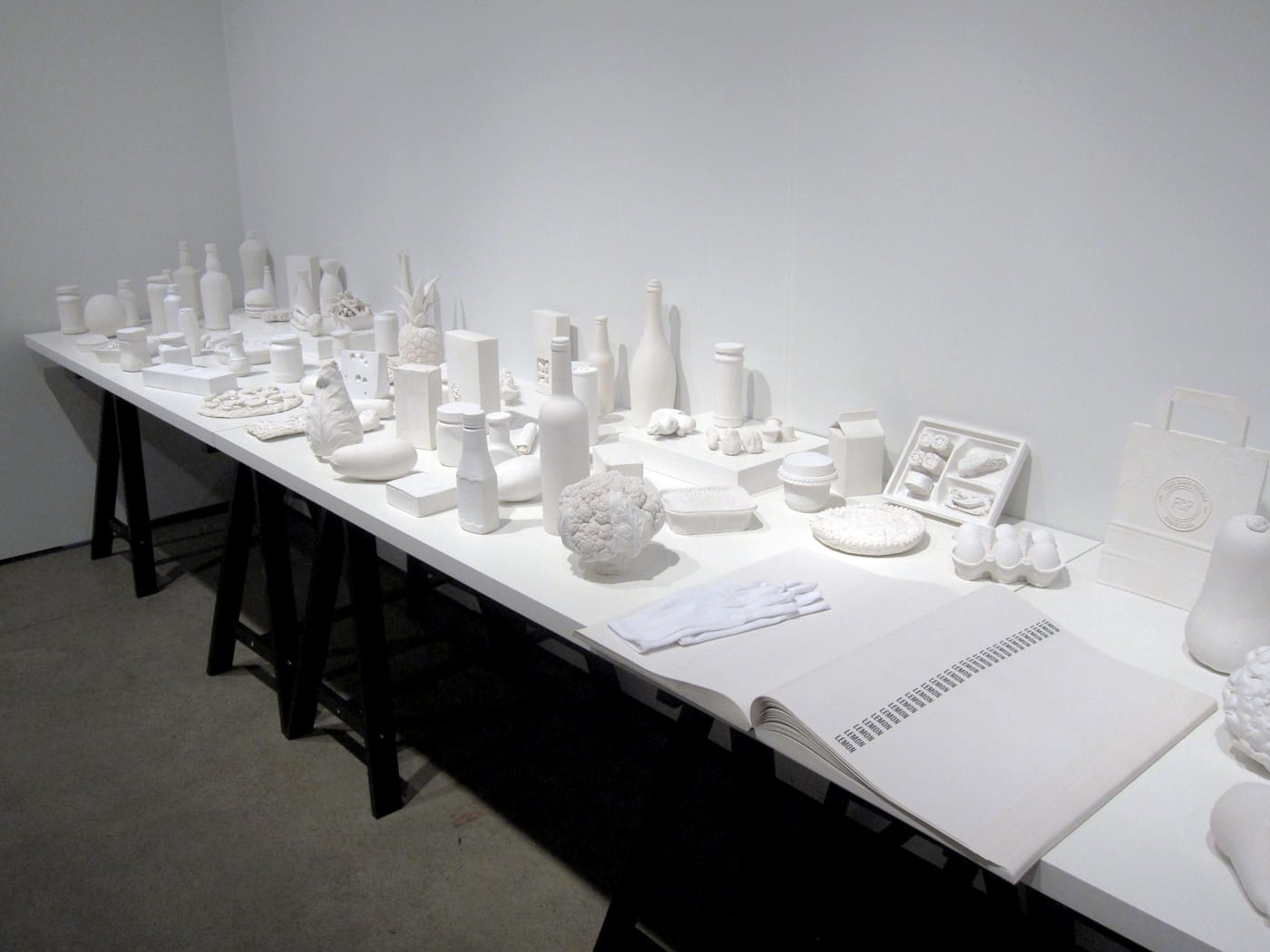What contributes significantly to EXPO Chicago’s overall sense of thoughtful curation are the Special Exhibitions booths scattered throughout the fair, presented by non-profits, museums, and art organizations. The Chicago Artists Coalition’s show is one of these memorable displays that introduce timely social issues to this premier event, along with Itamar Gilboa’s “Food Chain Project,” a portion of which is presented by Tamar Dresdner Art Projects. The sculptural spread of foodstuffs is overwhelming, and intends to raise awareness of global issues such as hunger and obesity, with proceeds from any sales going toward Food Tank. A number of works also grapple with environmental concerns, from “A Library of Tears” — a grim yet graceful display of manmade pollution by Artadia awardee Claire Pentecost — to “White Wanderer” — a meditation on glacial collapse by local duo Luftwerk, who recently unveiled a companion soundscape by the Chicago River.