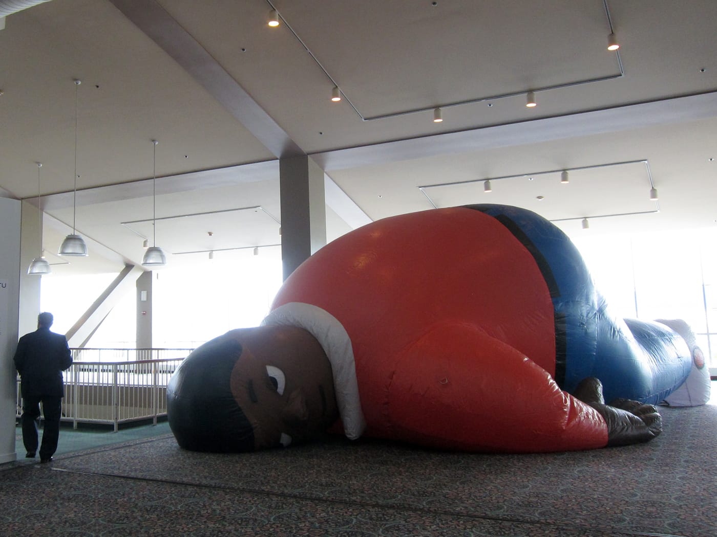 At EXPO, “Laocoön” is still being shown in a commercial space, but rather than placed within a booth, it is part of the IN/SITU program, an exhibition curated by Florence Derieux that features site-specific works installed around the Navy Pier. Biggers’s sculpture is the sole occupant a room to the side of but open to the main arena, a carpeted hallway surrounded by windows that features some stairways. Unlike in Miami Beach, the figure looks toward the main thoroughfare, instead of a wall. Here, he personifies a man who has just collapsed in a lobby from some unseen blow, and left alone. The piece is disturbing — some may say triggering — for the violence it immediately evokes. For as cartoonish as the man’s expression is, it is a face that confronts passersby, and one that’s part of a slowly heaving human body. “Laocoön” is impossible to avoid, as it lies near a busy intersection in the fair’s layout. But rather than just spectacle, or backdrop to a marketplace, the sculpture implores engagement beyond just looking. The piece questions whether people will stop when confronted with a black body slumped on the ground — and will they then acknowledge the brutalities inflicted on these bodies daily? Maybe it’s a naive attempt to engage fairgoers as they run around, perhaps with champagne in hand. But at an art fair, where you don’t expect to find politicized spaces, much less ones this conspicuous, that chance for reflection is something.