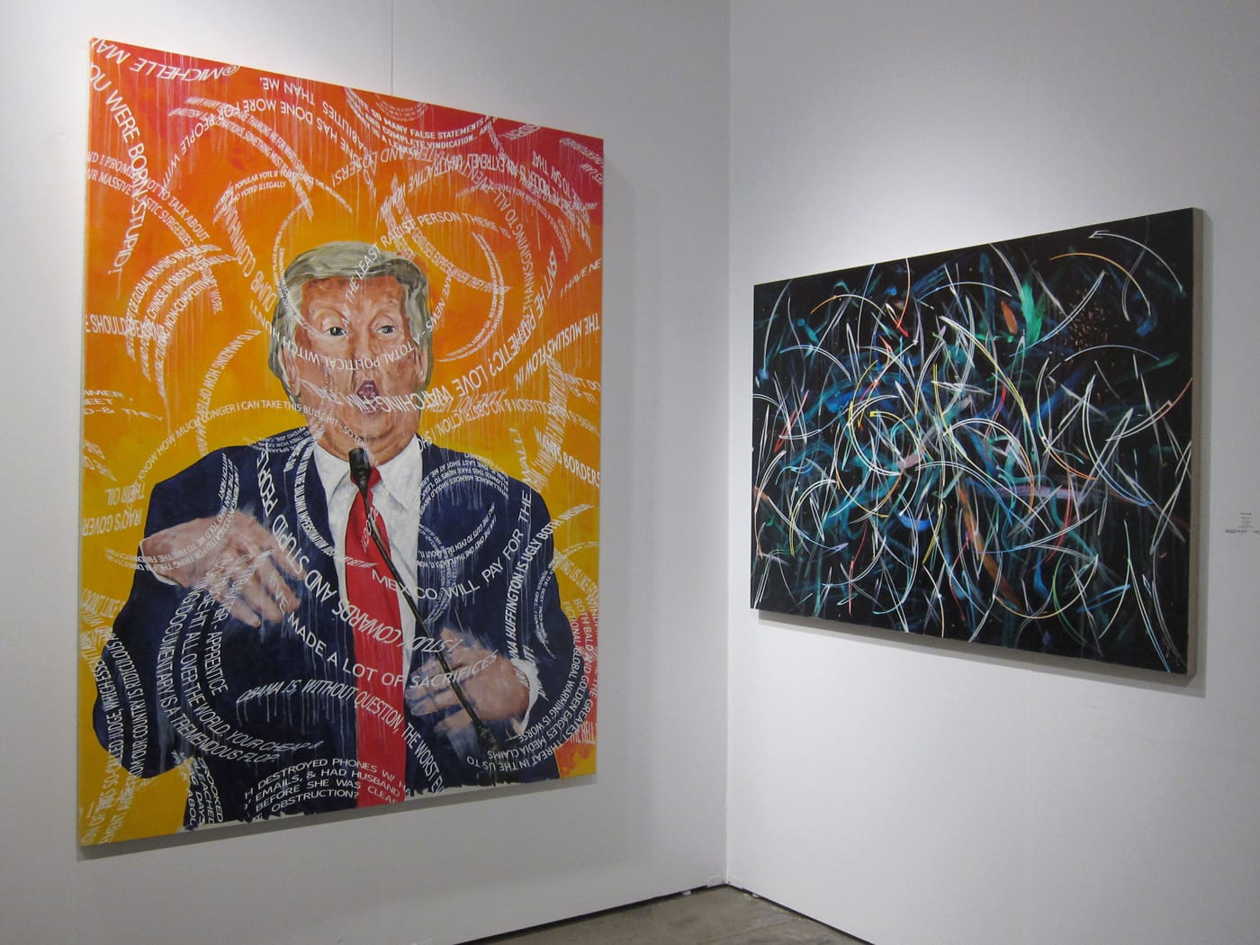 Then there are a handful of works that respond more specifically to the dark, disturbing days of our time. I spotted just one Donald Trump-inspired piece, a painting by Doug Argue at Marc Straus, which depicts the President frozen in a literal tweetstorm: Trump, shown in the infamous pose he made to mock a disabled reporter, is surrounded by fragments of his online rants, which swirl to form a nauseating vortex. More conspicuous was Anton Kern’s installation of large, square banners by Lara Schnitger, which hangs over an expansive seating area as part of the IN/SITU program. Schnitger’s “Suffragette City,” originally made for a 2015 performance, presents physical signs of the time, with each graphic banner incorporating feminist phrases like, “A Dress is Not a Yes.” The rallying cries are especially striking in this sterile setting, loud and defiant in both tone and design.